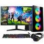 fora isso, ele também possui uma fonte gamer de 500w com certificação 80 plus, armazenamento via ssd que é até 10 vezes mais veloz que um hd tradicional e para finalizar acompanha monitor e um kit gamer rgb completo.