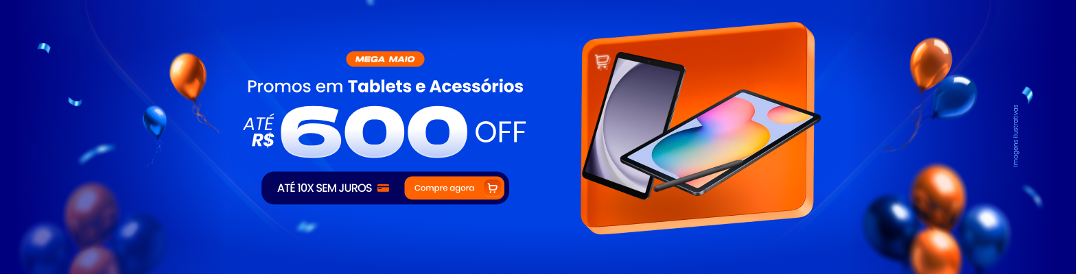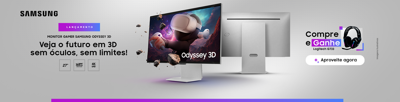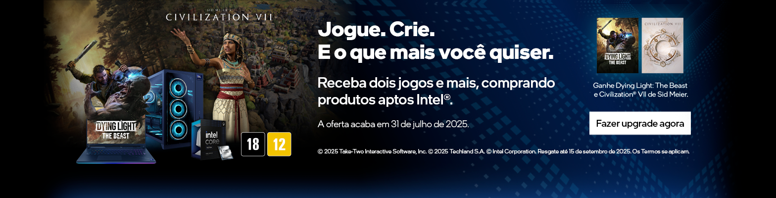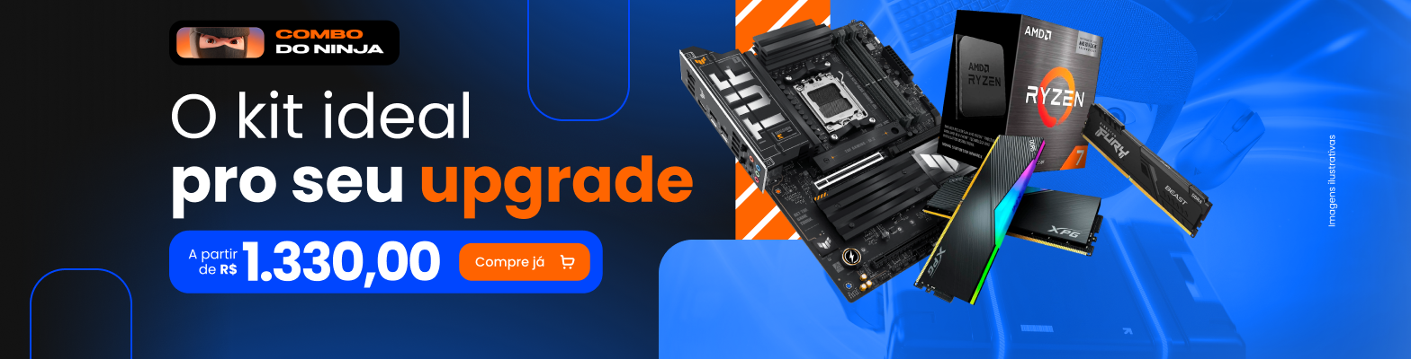 Banner com o texto: Comece a montar seu PC agora e receba montado. Botão: Montar meu PC. Ícones de processador, gabinete e placa de vídeo sobre fundo escuro com detalhes laranja.