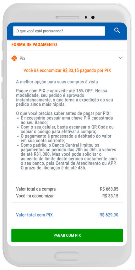 O PIX é um meio de pagamento criado pelo Banco Central. Verifique se o seu banco possui essa funcionalidade e faça seu cadastro para poder efetuar suas compras. Para as compras efetuadas com o PIX, o cliente deve considerar o mesmo valor praticado à vista. Após a aprovação do pagamento, ele não pode ser revertido. O exercício do Direito de Arrependimento poderá ser feito em até 07 (sete) dias corridos, a contar da data de recebimento da compra, nos moldes do artigo 49 do Código de Defesa do Consumidor. A liberação do pedido para remessa e postagem está condicionada às políticas internas de cada instituição financeira e, portanto, poderá haver o cancelamento do pedido via PIX, assim como em qualquer outro meio de pagamento implementado. Ainda referente à modalidade, fica a critério de cada instituição financeira estabelecer um limite máximo para a realização de pagamentos, sendo responsabilidade do cliente se informar a respeito dessa condição, junto ao seu banco. A liberação do pedido ocorrerá dentro do período de segunda-feira a sábado, das 6h às 22h. Caso a sua compra seja feita entre às 22h01 e 5h59 durante a semana, no domingo ou em feriados, a liberação ocorrerá no período mais próximo posterior.