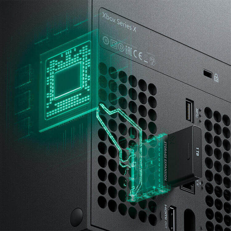 O cartão de expansão de 1TB do Xbox Series X oferece armazenamento adicional para jogos com velocidade e desempenho total ao replicar a experiência do SSD personalizado interno do console.