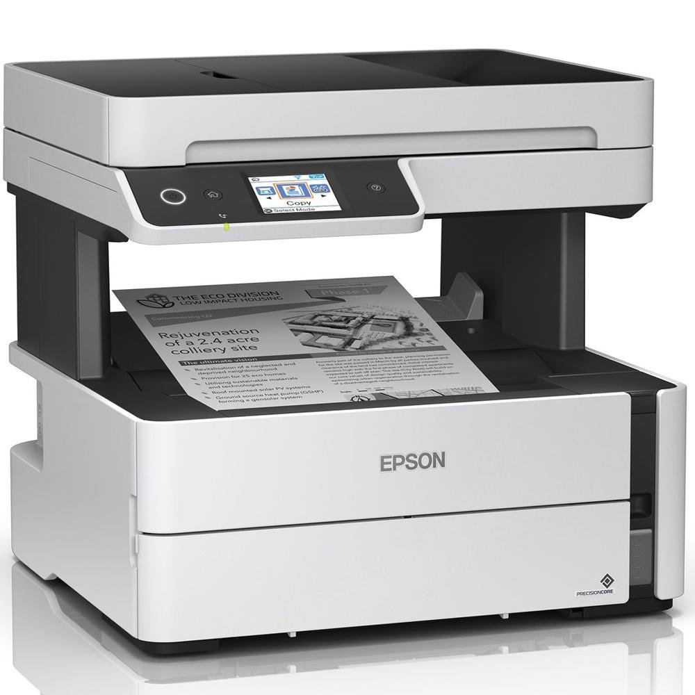 A impressora multifuncional monocromática EcoTank M3170 utiliza a tecnologia PrecisionCore. É ideal para empresários que buscam o máximo de desempenho e produtividade no escritório. Oferece impressão livre de cartuchos, com tanques de tinta fáceis de abastecer. As duas garrafas de tinta inclusas na caixa permitem que você imprima até 11.0004 páginas em preto. Além disso, a EcoTank M3170 alcança velocidades de até 39 páginas por minuto, conta com alimentador automático de documentos, impressão automática frente e verso, ethernet para grupos de trabalho, fax, e conectividade wireless para impressão via dispositivos móveis.
