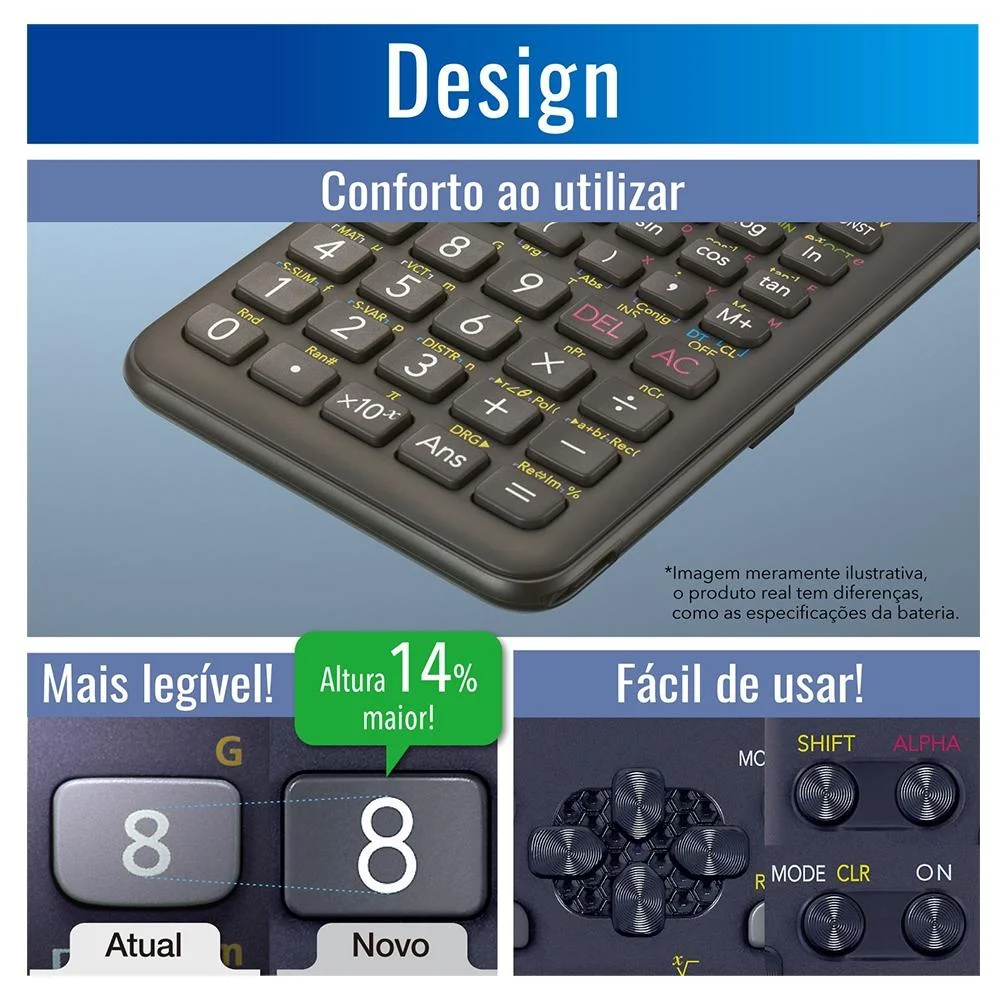 A linha de calculadoras Casio facilita o seu dia a dia em casa, no trabalho e na faculdade. Fáceis de usar, precisas e seguras, as calculadoras científicas Casio estão desenhadas para estudantes e profissionais, e oferecem excelente rendimento em todos os níveis por muitos anos. De fácil uso e desenhada para adaptar-se aos seus desafios, a FX-82MS com 240 funções se encarrega dos problemas mais difíceis.