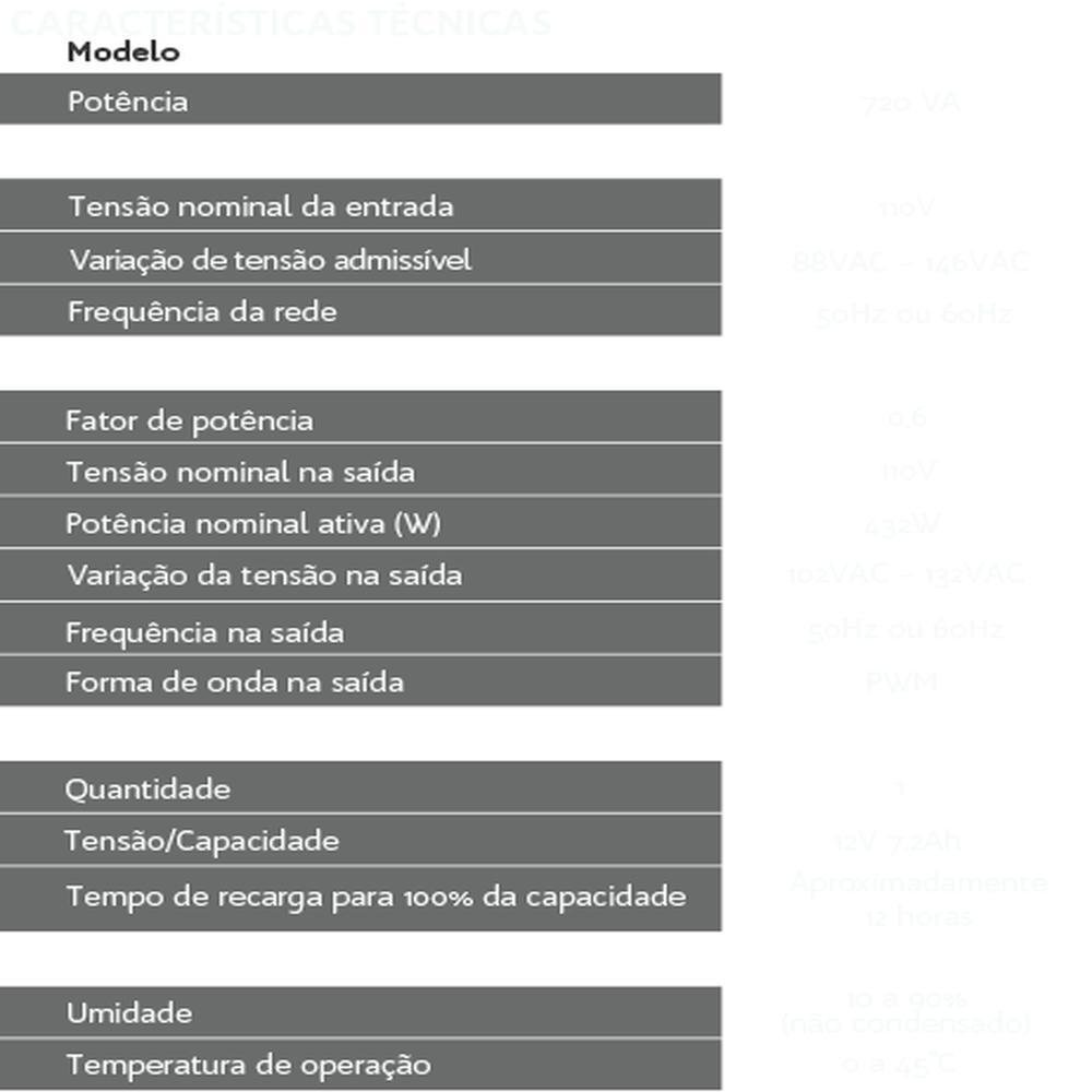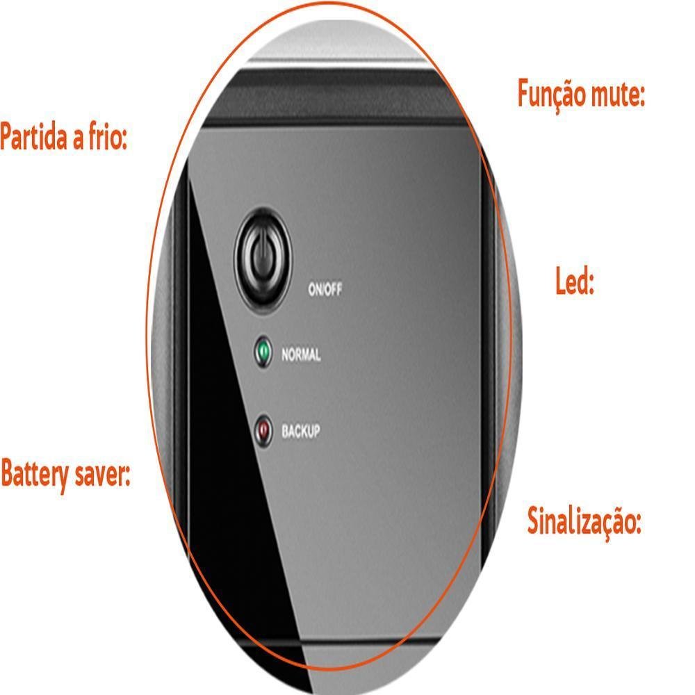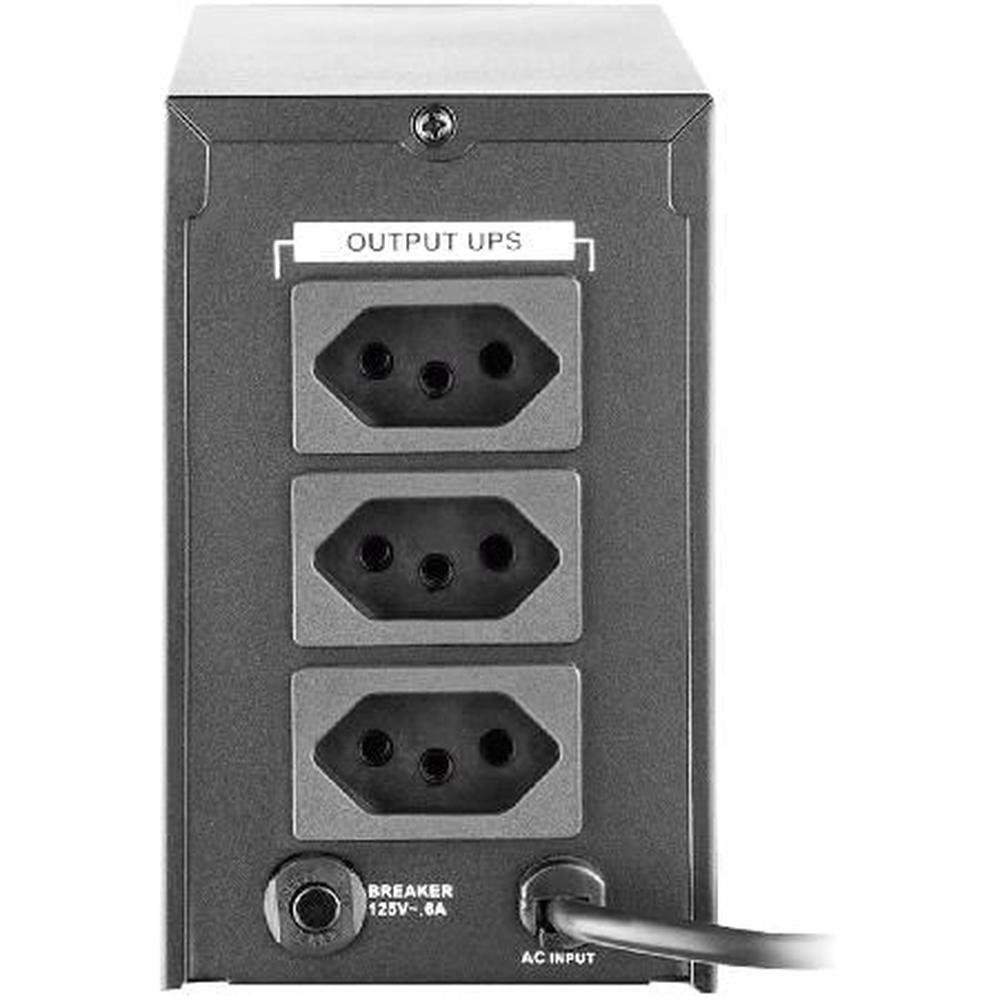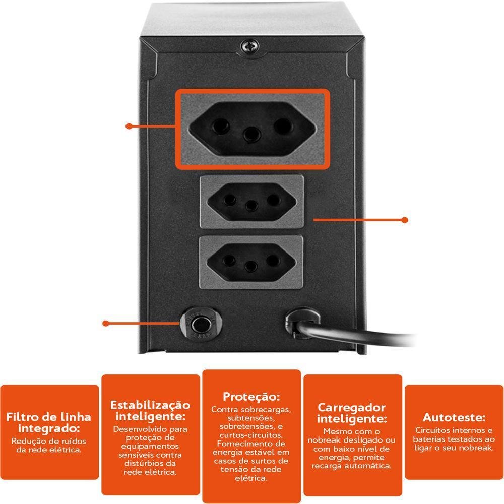 Reserva de energia com máxima estabilidade 6 níveis de proteção: Queda de rede, Ruído de rede elétrica, Sobretensão de rede elétrica, Subtensão de rede elétrica, Surtos de tensão na rede, Correção de variação da rede elétrica por degrau, Tomada de 3 pinos (padrão brasileiro), 3 tomadas de saída, Fusível resetável, Filtro de linha integrado: redução de ruídos da rede elétrica. Estabilização inteligente: desenvolvido para proteção de equipamentos sensíveis contra distúrbios da rede elétrica. Proteção: contra sobrecargas, subtensões, sobretensões, e curtos-circuitos. Fornecimento de energia estável em casos de surtos de tensão da rede elétrica. Carregador inteligente: mesmo com o nobreak desligado ou com baixo nível de energia, permite recarga automática. Autoteste: circuitos internos e baterias testados ao ligar o seu nobreak. Partida a frio: permite ligar o seu nobreak mesmo com a ausência de rede elétrica. Battery saver: quando a bateria estiver com baixa carga, seu nobreak será desligado para protegê-la. Função mute: permite inibir sinais sonoros do seu nobreak. Led: led bicolor que indica as principais condições de operação do nobreak. Sinalização: com luzes indicadoras e função sonora, possibilita a visualização do status do seu nobreak. Indicações de uso: computadores, roteadores, TVs, switches, CFTV, DVRs, PABX/Telefonia, periféricos de informática...