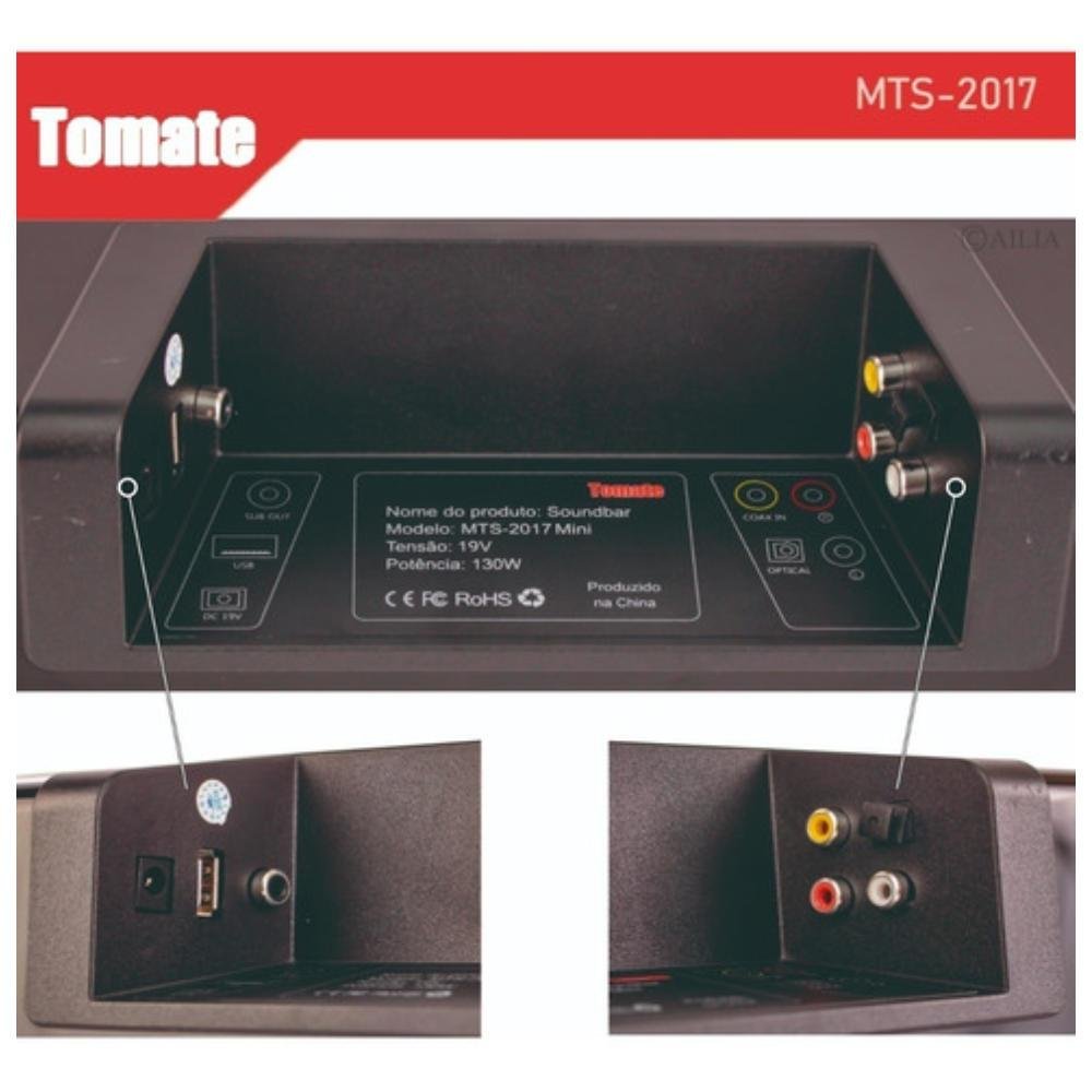 Descrição Caixa de som Soundbar Tomate 150w + Subwoofer Soundbar central com conexão Bluetooth Entradas: Pen drive, óptico, coaxial, RCA Subwoofer com 80w de potência Alto falante de 8 polegadas no Sub Soundbar possui suporte para fixar na parede Use na parede ou no rack Acompanha controle remoto, fonte de alimentação, cabo óptico, cabo RCA x P2, cabo de conexão do subwoofer, régua de medição, buchas e parafusos Medidas Soundbar: 96cm x 9cm x 7cm Medidas Subwoofer:33cm x 30cm x 25cm Produtos enviados na caixa original Especificações técnicas: Marca: Tomate Modelo: MTS-2017 Potência: 150w rms Conexão sem fio: Bluetooth Entradas: óptico, Coaxial, RCA, Pen drive Rádio FM: não Compatíbilidade: TV, Celular, Tablet, PC, Notebook Canais de áudio: 2.1 Conexão Sub / soundbar: Fio (4mts) Soundbar: 4 altofalantes full-range + 2 tweeters Subwoofer: 1 alto falante 8 polegadas Nível sonoro: 100dB Resposta de frequência: 50 Hz a 19 KHz Medidas Soundbar: 96cm x 9cm x 7cm Medidas Subwoofer:33cm x 30cm x 25cm Alimentação: 110/220v (fonte 19v) Itens inclusos: 1x Soundbar 1x Subwoofer 1x Controle remoto 1x Fonte de alimentação bivolt 1x Cabo óptico 1x Cabo RCA x P2 1x Cabo de conexão soundbar/subwoofer 4 metros 2x Parafusos 2x Buchas 1x Régua/gabarito para fixar soundbar à parede