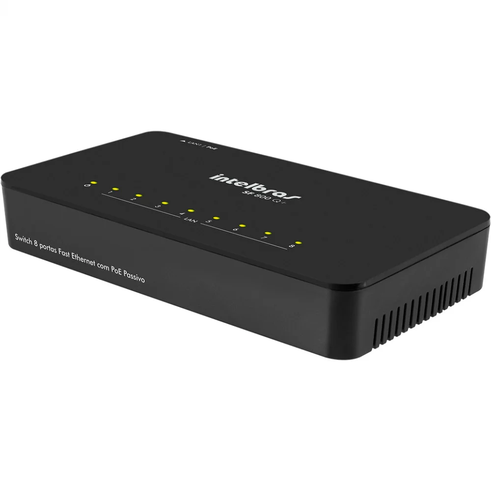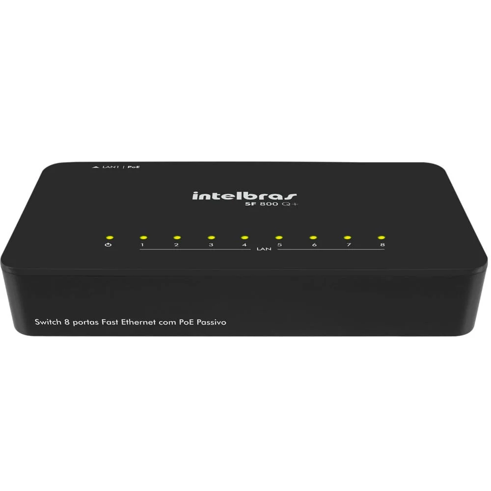 Switch 08 portas Sf800Q + 10/100Mpbs IntelbrasO Switch Sf800 Q + possui 8 portas Fast Ethernet 10/100 Mbps que viabiliza a construção de redes de comunicação de dados permitindo a integração de computadores, impressoras, dispositivos VoIP como ATA e telefone IP, além de proporcionar o compartilhamento de internet para os demais dispositivos conectados a ele.Solução ideal para quem busca um produto versátil e compacto com um excelente custo benefício. Sua porta LAN 1 possui suporte a PoE Passivo, que permite a alimentação do switch através do cabo de rede na presença de um injetor PoE Passivo. O SF 800 Q+ também possui a função Qualidade de Serviço (QoS) para garantia de qualidade do tráfego de pacotes, priorizando aplicações de dados, voz, vídeo e controle de banda.-Marca: Intelbras-Modelo: Sf800QCaracterísticas:- Atende as normas IEEE802.3, IEEE802.3u, IEEE802.3x, IEEE802.1p e IEEE802.3az- Plug & Play, tornando a instalação simples e rápida.- Possui 8 portas RJ45 Fast Ethernet com negociação automática de velocidade- QoS para priorização do tráfego de dados, voz e vídeo.- Possui a porta 1 com suporte a PoE Passivo, sendo possível ligar o switch atráves de um cabo de rede utilizando um adaptador PoE Passivo, caso não haja uma tomada elétrica próxima ao switch.Obs: o adaptador PoE Passivo não está incluso com o produto.- Tecnologia Inteligente para economia de energia- Throughput de até 1.6 Gbps- Possibilidade de ser alimentado por PoE Passivo pela porta LAN1- Leds indicadores na parte superior