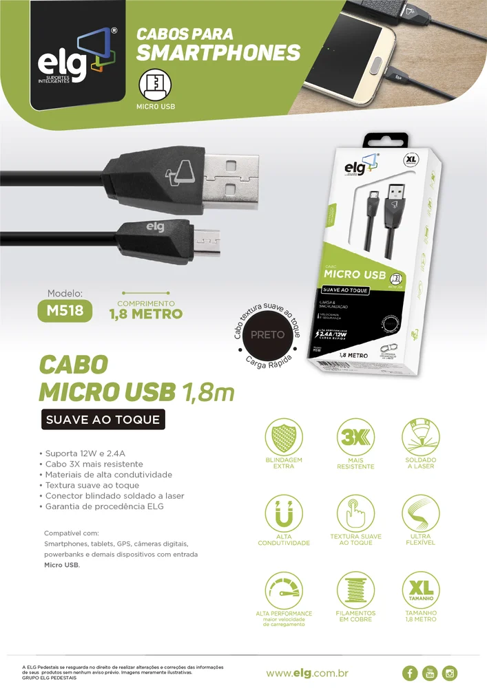 Características: Marca: ELG Modelo: M518 Cor: Preto Design moderno e compacto, ideal para seu dia-a-dia. É ideal para sincronizações e recargas seguras e eficientes, pois seus condutores internos são produzidos em cobre, ou seja, melhor qualidade de transmissão de dados e velocidade durante as recargas.
