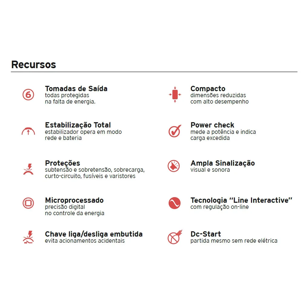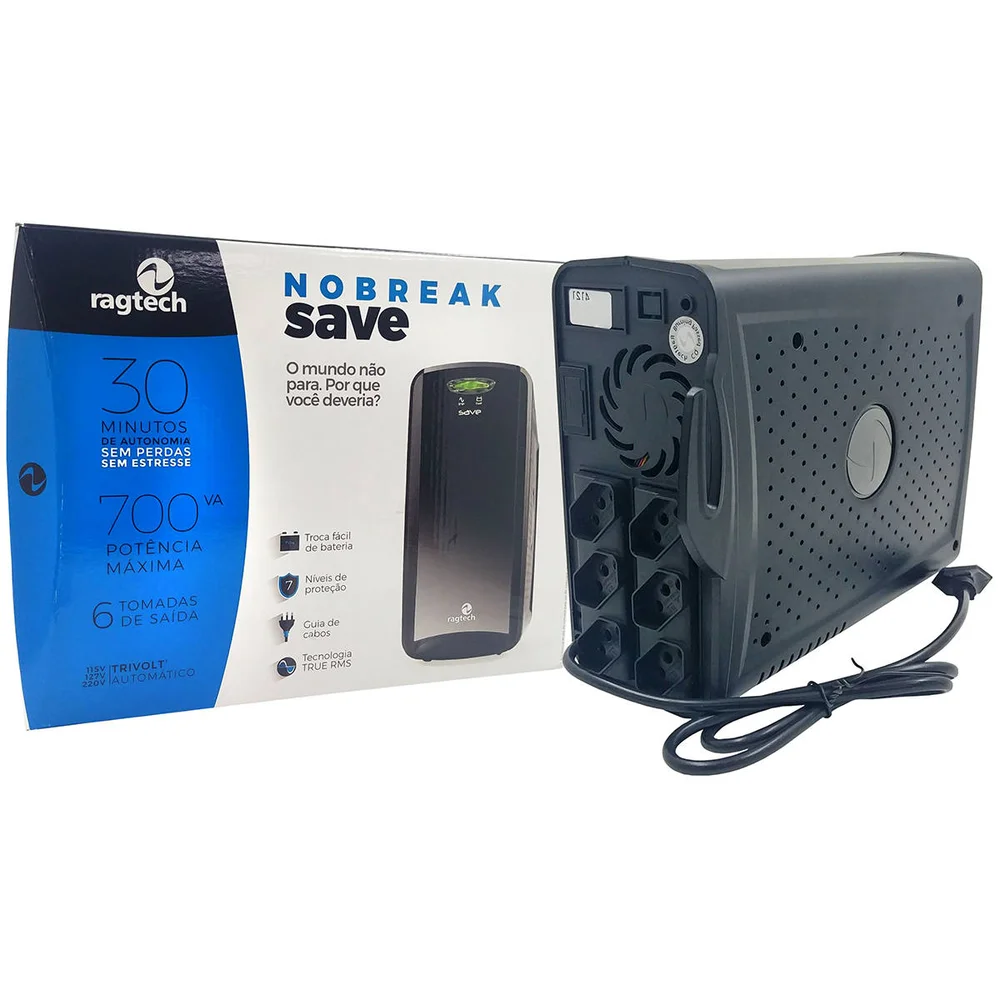 Nobreak 700VA 350W PWM E.115/127/220V S. 115V Compacto com Filtro e Estabilizador Troca Fácil de Bateria 6 Tomadas Ragtech 4121 Nobreak compacto de 700VA com função 3 em 1, além da função de nobreak, também funciona como estabilizador e filtro de linha. Especialmente desenvolvido para fornecer energia ininterrupta, estabilizada e filtrada, protegendo e mantendo em funcionamento, nas falhas ou ausência de energia elétrica, os equipamentos de informática, áudio e vídeo, hubs, switchs, PDVs, terminais de rede, dispositivos de wireless, etc. Outro recurso deste Nobreak é a Troca Fácil da Bateria, que ao final de sua vida útil, pode ser trocada pelo próprio usuário. Também possui o recurso Battery Save, que evita a descarga desnecessária de bateria. Proteja seus equipamentos contra subtensão e sobretensão, e ainda contra sobrecarga e curto-circuito e também mantenha-os ligados na falta de energia para ter tempo suficiente de fechar seus arquivos e aplicativos corretamente com este No-break 700VA da Ragtech, tudo com o melhor custo-benefício para você!