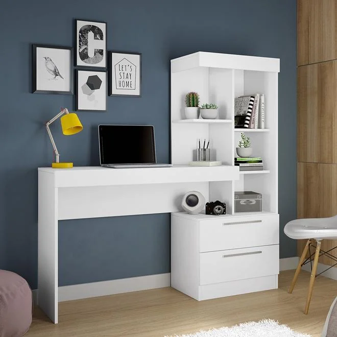 Enquanto o tampo acomoda o seu computador e demais objetos importantes, os nichos laterais permitem que outros objetos fiquem sempre à mão.