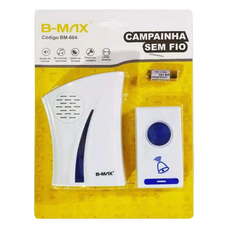 Loja MTGM > DESCRIÇÃO: - Não instale este produto em local ensolarado ou chuvoso; - Quando você instalar, por favor manter alguma distância entre este produto e o metal, caso contrário irá afetar a distância remota do transmissor e receptor; - Campainha B-MAX design inovador e elegante, 36 tipos de toques diferentes para você escolher qual mais fica adequado ao seu ambiente de instalação; - Evite deixar aquela sua visita importante esperando em seu portão. Produto super simples de se utilizar, basta colocar as pilhas, colocar em um lugar onde possa ouvir e anexar o botão em seu portão. Não utiliza fios o que torna muito mais pratica.