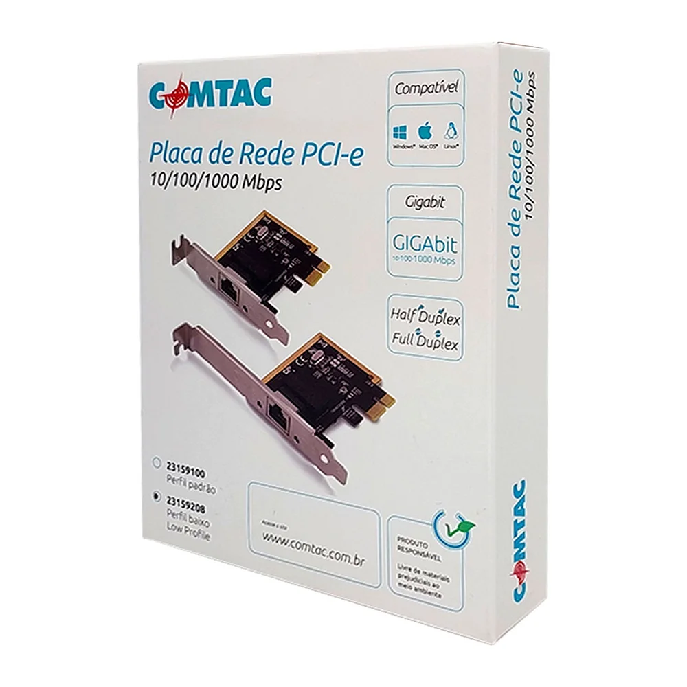 A Placa de Rede Pci-e 10/100/1000 Mbps - Low Profile Comtac, Possui Interface de Rede Ethernet Lan Base 10/100/1000 de Alto Desempenho. Oferece Uma Solução de Baixo Custo para Conectar-se Com Redes Locais Lan de Alta Velocidade (1000 Mbps), Sendo 10 Vezes Mais Rápida Que a Ethernet Padrão. Indicada para Empresas e Residências, Esta Placa é Compatível Com Redes 10/100 Base-t, Permitindo Que Seja Facilmente Incorporada Em Qualquer Rede Já Existente. Placa de Rede 1000 Base-t de Alto Desempenho