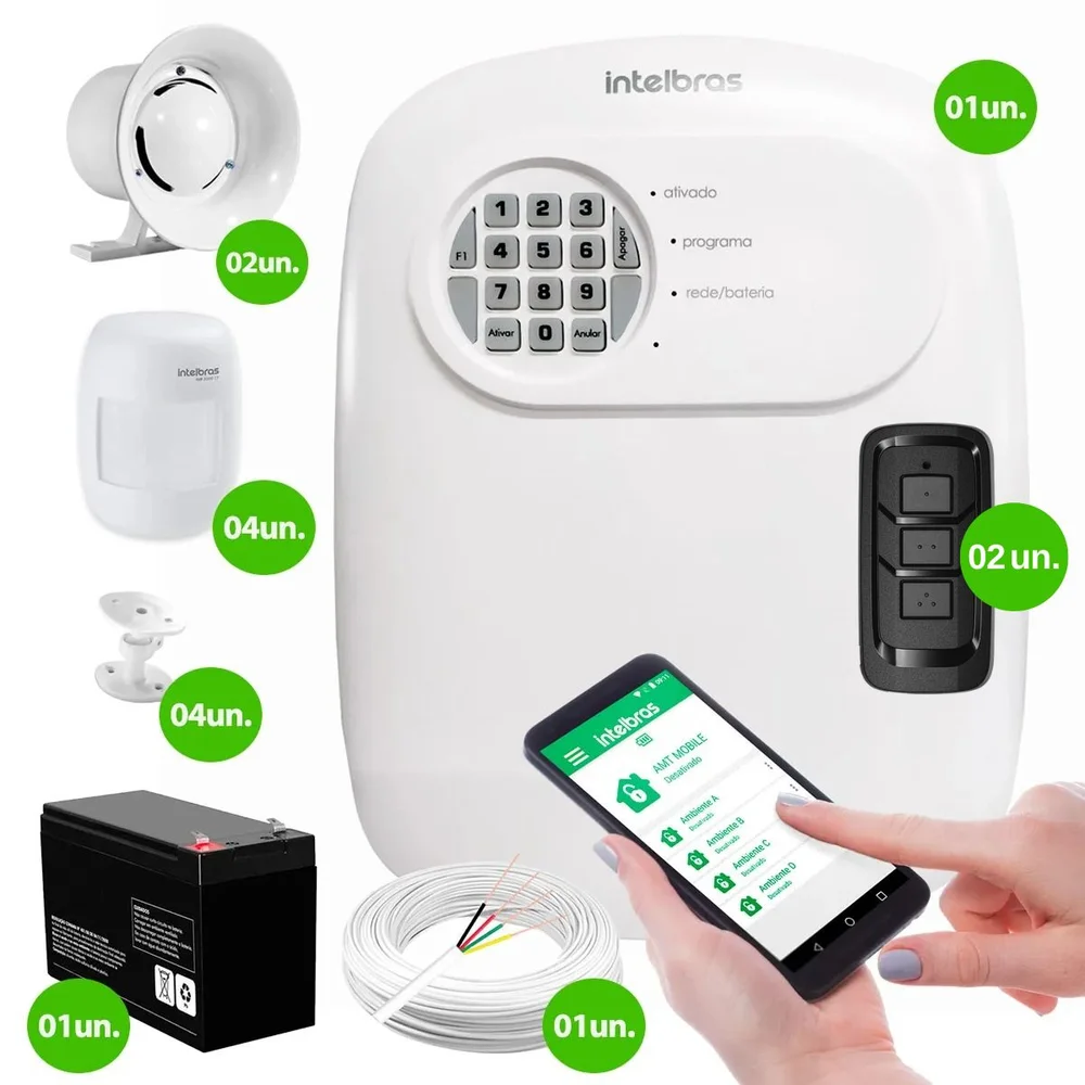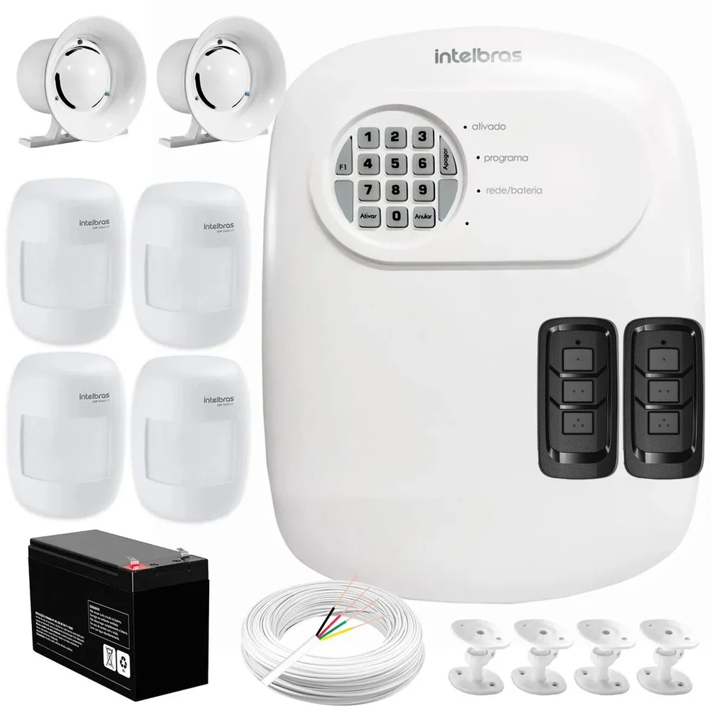 conteúdo do kit 01 central de alarme anm 24 net intelbras 02 controle remoto preto intelbras 04 sensor de presença infravermelho ivp 3000 cf intelbras com fio passivo alcance de 12mts 04 articulador 01 cabo de alarme 4 vias 0,40mm - 100 metros 01 bateria para central de alarme 12v 02 sirene compacta de alta potência 12v