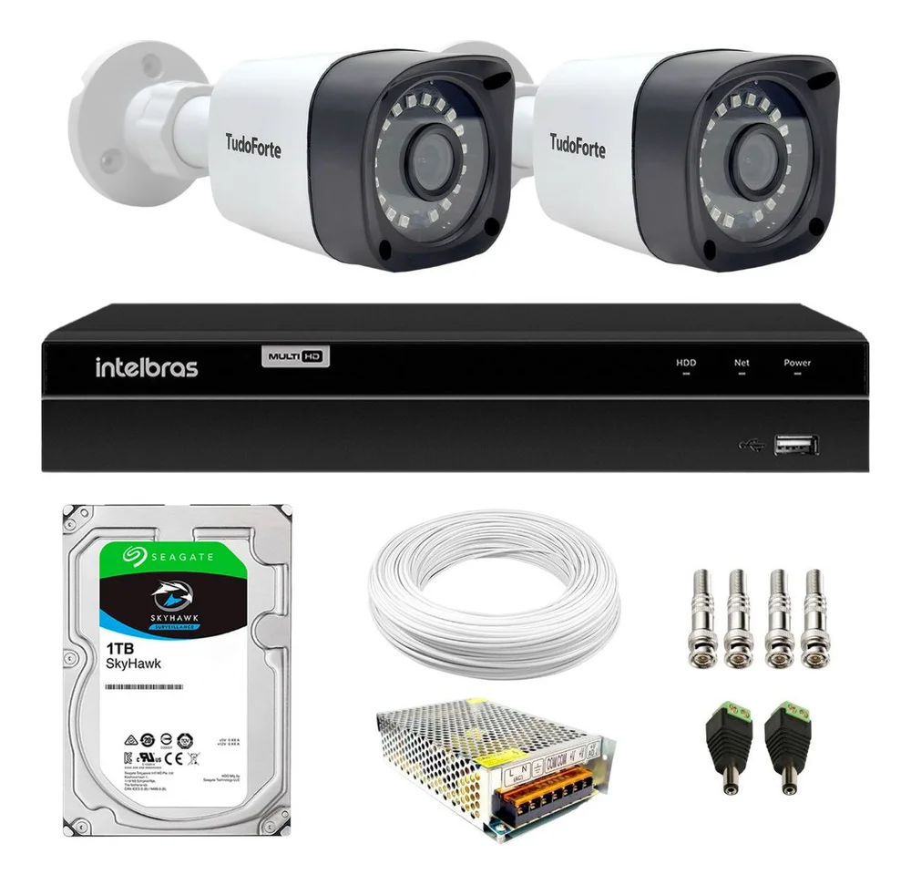 Kit 2 Câ,meras Full HD 1080p 2MP Bullet 20 Metros Infravermelho Tudo Forte + DVR Gravador de Video Inteligente Intelbras MHDX 1204 4 Canais + HD 1TB Itens Inclusos No Kit 01 - DVR Intelbras 4 canais MHDX 1204 Com Detecç,ã,o Inteligente de Movimento 02 - Câ,mera de Seguranç,a Full HD 1080p 2MP Bullet 20 Metros Infravermelho Tudo Forte 01 - Cabo Coaxial Flexí,vel 85% Malha, Bobina 100 01 - Fonte Chaveada 12V 5A Tipo Colmeia Ideal para CFTV 04 - Conectores BNC Macho com Mola de parafuso 02 - Conectores P4 de Borne para Alimentaç,ã,o 12V 01 - HD 1TB Seagate Surveillance Skyhawk - Pró,prio para DVR e NVD Especificaç,õ,es da Câ,mera 1080p Tudo Forte Modelo 1080p Tudo Forte