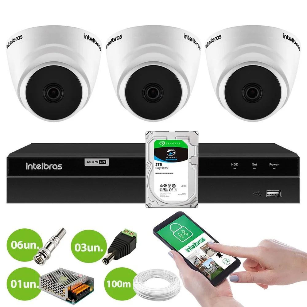 Kit 3 Câ,meras Dome VHL 1220 D - HDCVI Lite 2MP - 20m, Full HD 1080p 2,8 mm + DVR Gravador de Video Inteligente Intelbras MHDX 1204 4 Canais + HD 2TB Itens Inclusos No Kit 01 - DVR Intelbras 4 canais MHDX 1204 Com Detecç,ã,o Inteligente de Movimento 03 - Câ,mera Dome VHL 1220 D - HDCVI Lite 2 megapixels Intelbras 20m, Full HD 1080p Lente 2,8 mm 01 - Cabo Coaxial Flexí,vel 85% Malha, Bobina 100 01 - Fonte Chaveada 12V 5A Tipo Colmeia Ideal para CFTV 06 - Conectores BNC Macho com Mola de parafuso 03 - Conectores P4 de Borne para Alimentaç,ã,o 12V 01 - HD 2TB Seagate Surveillance Skyhawk - Pró,prio para DVR e NVD
