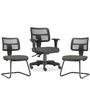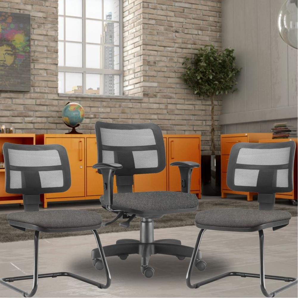 Kit Cadeira De Escritório Giratória E 02 Cadeiras Fixas Zip L02, Linho Cinza Escuro - Lyam Decor