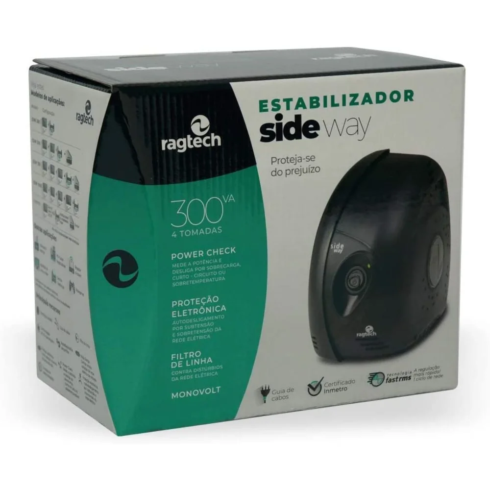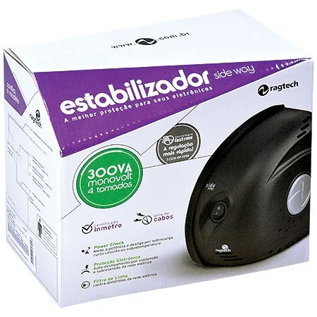 A Ragtech inova mais uma vez com a linha de estabilizadores Side Way, harmonizando tecnologia e design. Apresenta recursos avançados e exclusivos: tempo de resposta ultra rápido [o mais veloz de sua categoria] e guia de cabos para organizar a saída dos cabos conectados. Possui tecnologia true rms que garante regulação precisa mesmo em redes distorcidas. São produzidos com padrão de qualidade que atendem à norma de segurança e desempenho NBR 14373:2006 da ABNT.