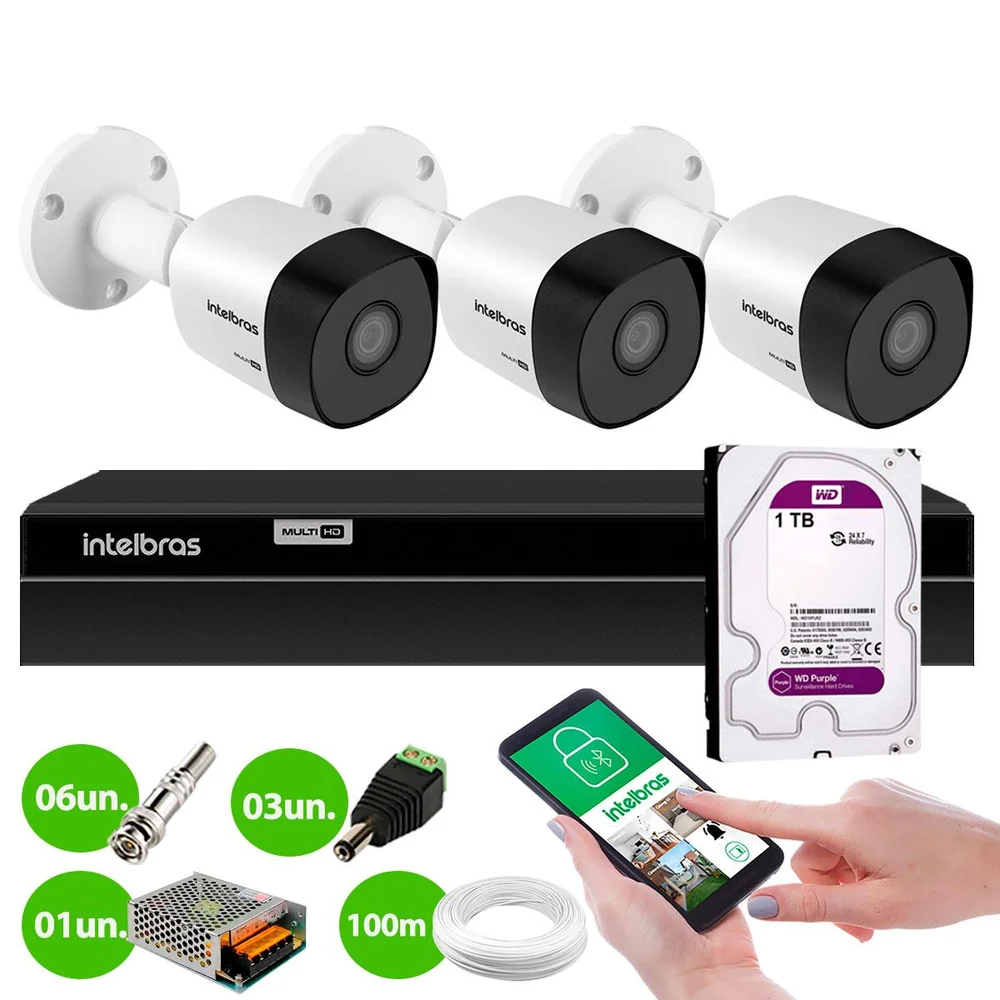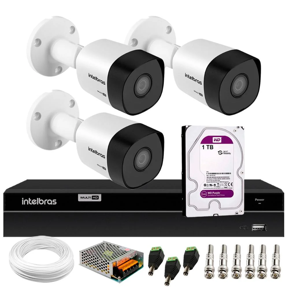 Kit 3 Câmeras Bullet Hd 720p Vhd 3130 B G6 3,6mm - 30m Ip67 + Dvr Intelbras Mhdx 1204 4 Canais + Hd 1TB Purple