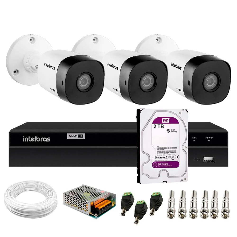Kit 3 Câmeras Bullet Segurança VHD 1220 B Full HD 1080p, DVR Intelbras, Mhdx 1204, 4 Canais, 2TB Purple