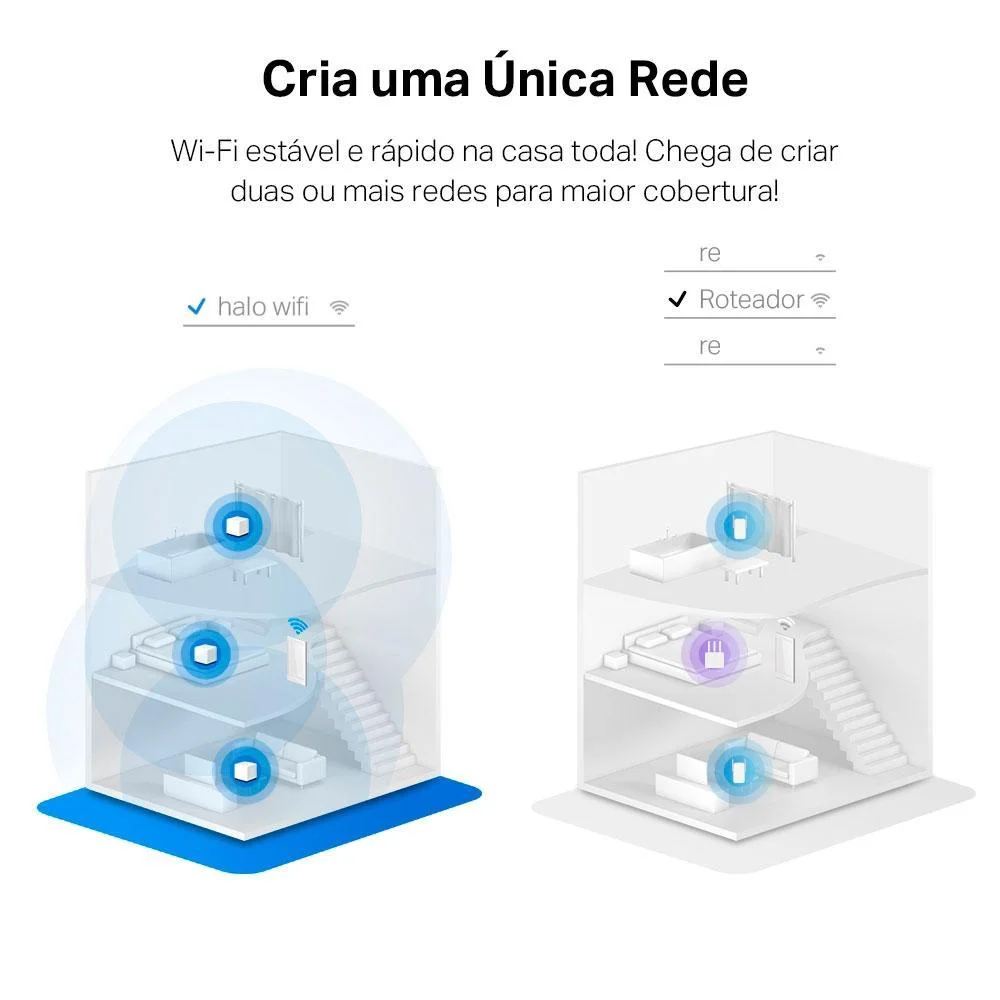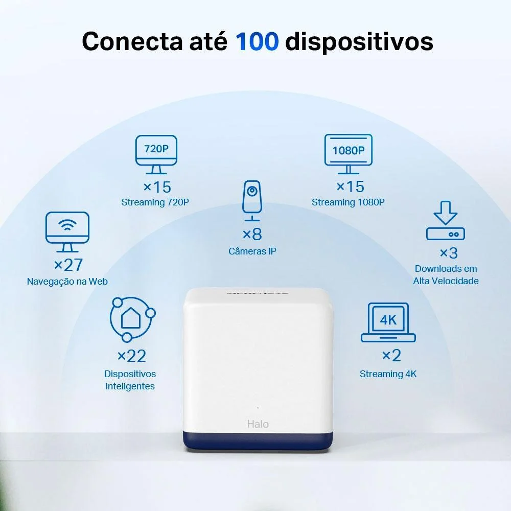 Tenha a Cobertura Completa do Wi-Fi Mesh na sua Casa Sistema Wi-Fi Mesh para Toda a Casa AC1900 Halo H50G Solução Wi-Fi para Toda a Casa Nada é pior do que conexões não confiáveis ??e velocidades de internet incapazes de acompanhar seu estilo de vida digital. O Halo funciona como um sistema unificado para garantir um sinal WiFi forte em todos os cantos da sua casa, proporcionando uma experiência de rede incrivelmente rápida e estável. Quedas de conexão e páginas de carregamento serão coisas do passado. Streaming Streaming na Casa Toda Non-Stop EntertainmentEntretenimento sem Interrupção Signals Never DropSinal Estável Easy App ControlControle por Aplicativo Forte Transmissão em Todos os Ambientes Comparado com um único roteador comum que tem alcance limitado para cantos remotos da casa, o kit Halo H50G com duas peças funciona como um sistema unificado para garantir um sinal WiFi rápido e estável em toda a sua casa, cobrindo até 350 m² e eliminando zonas de sombra de Wi-Fi. Compatível com Todos os Formatos de Residências O kit Halo permite que você espalhe as unidades, sendo assim compatível com diversos formatos de residências. Se não for suficiente, você pode expandir a cobertura Mesh Wi-Fi simplesmente adicionando mais unidades Halos da série H..