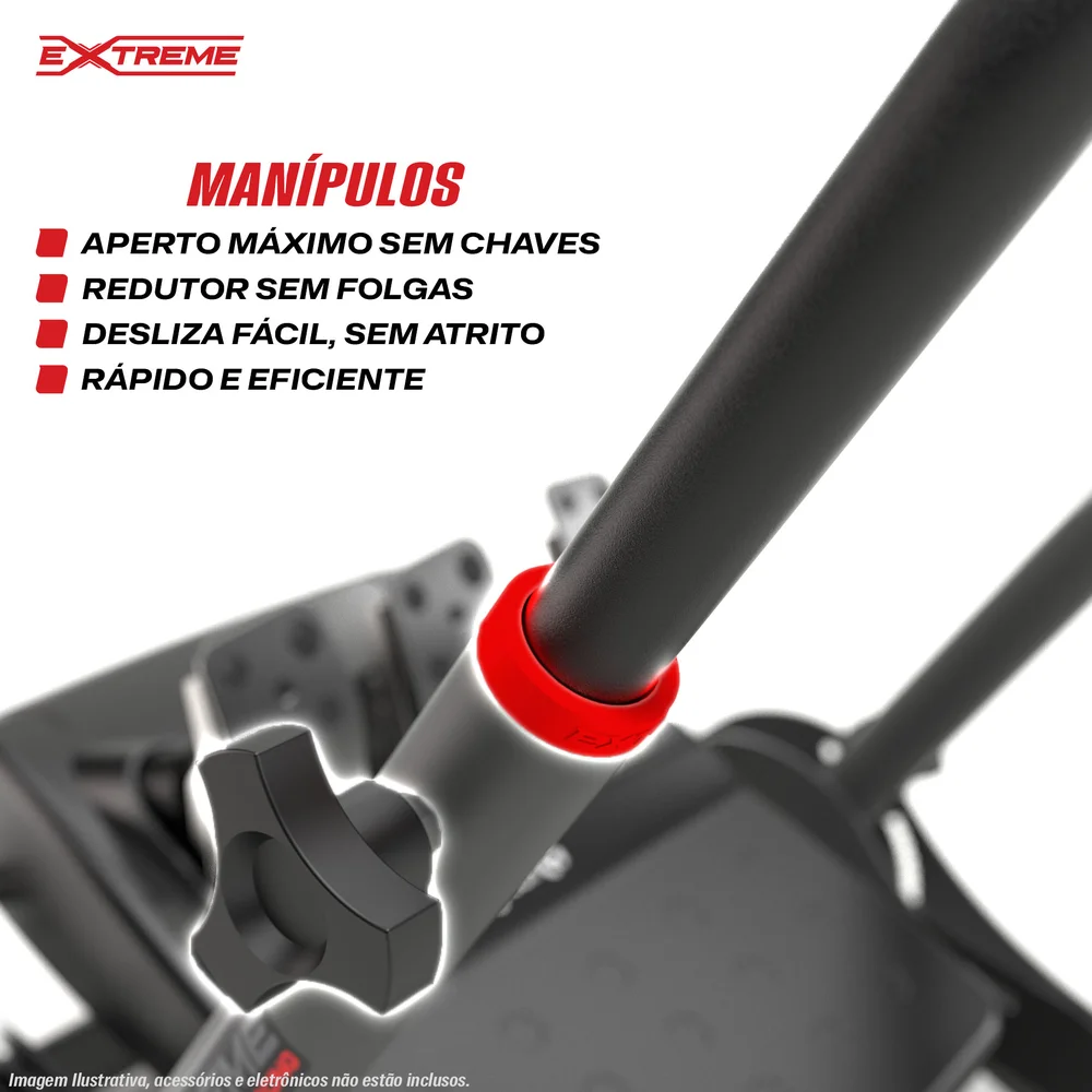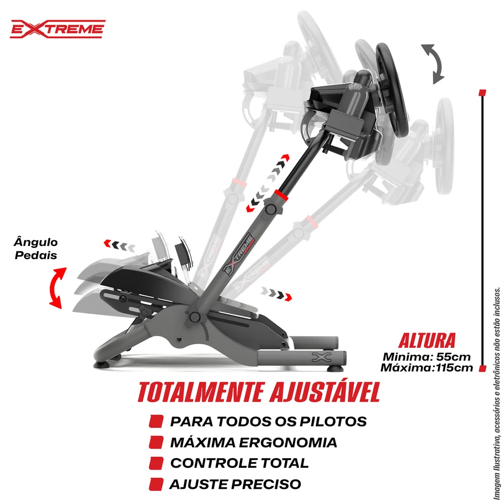 O Suporte para volante SGT oferece a mais balanceada experiê,ncia para quem pilota com volante, pedais e câ,mbio no simulador: seu design é, marcante, com grande amplitude nos ajustes atravé,s de maní,pulos e muita estabilidade com sua estrutura em aç,o, que possui dois tubos para a base do volante. O SGT conta com o ajuste de altura, de â,ngulo, e um 3º, ajuste independente do â,ngulo da base do volante, o que permite maior projeç,ã,o do aro em relaç,ã,o aos pedais, sendo assim ideal para quem pretende jogar sentado no sofá, ou poltronas de frente a TV da sala. Construç,ã,o e acabamentos no padrã,o Extreme Simracing, e design projetado para a melhor ergonomia de pilotagem Turismo / GT! Itens inclusos: Estrutura suporte com base para volante, apoio de câ,mbio superior, (ao lado do volante), apoio de copo e base para pedais. (ELETRÔ,NICOS E OUTROS ACESSÓ,RIOS NÃ,O INCLUSOS). Compatibilidade e Recursos: - Compatí,vel com os principais modelos de volante e pedais das marcas Logitech, Thrustmaster e Fanatec. Fixaç,ã,o atravé,s de parafusos e hastes inclusas (caso seu eletrô,nico permita esta fixaç,ã,o). - Apoio superior compatí,vel com câ,mbios H da Logitech e Thrustmaster, - Apoio para copo ao lado do volante, - Base do volante com ajuste de altura por maní,pulo, inclinaç,ã,o da chapa do volante por parafusos e inclinaç,ã,o total da base do volante por maní,pulos. Pedaleira com ajuste de altura/inclinaç,ã,o atravé,s dos maní,pulos e ajuste de profundidade atravé,s de sua fixaç,ã,o pelos parafusos. - Rebatí,vel com o volante e pedais ainda montados na estrutura, ainda mais compacto para guardar, - Construí,do em aç,o carbono reforç,ado, com pintura eletrostá,tica a pó, com tratamento anti-ferrugem e soldas completas e de primeira qualidade, produto com alta durabilidade, - Bucha de acabamento para ajuste suave e preciso da altura do volante (nã,o raspa metal com metal), - Pé,s emborrachados e com sistema de nivelamento, estabilidade em qualquer piso,