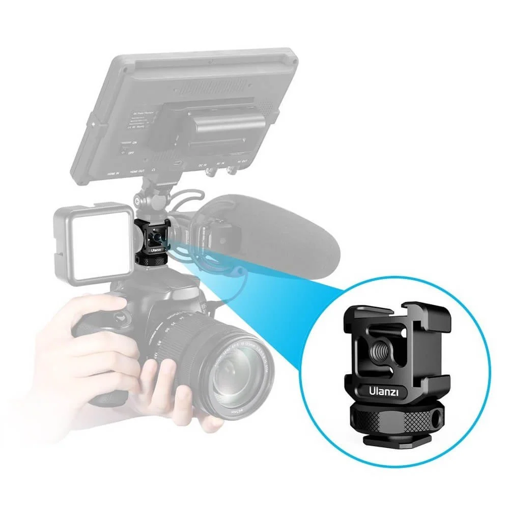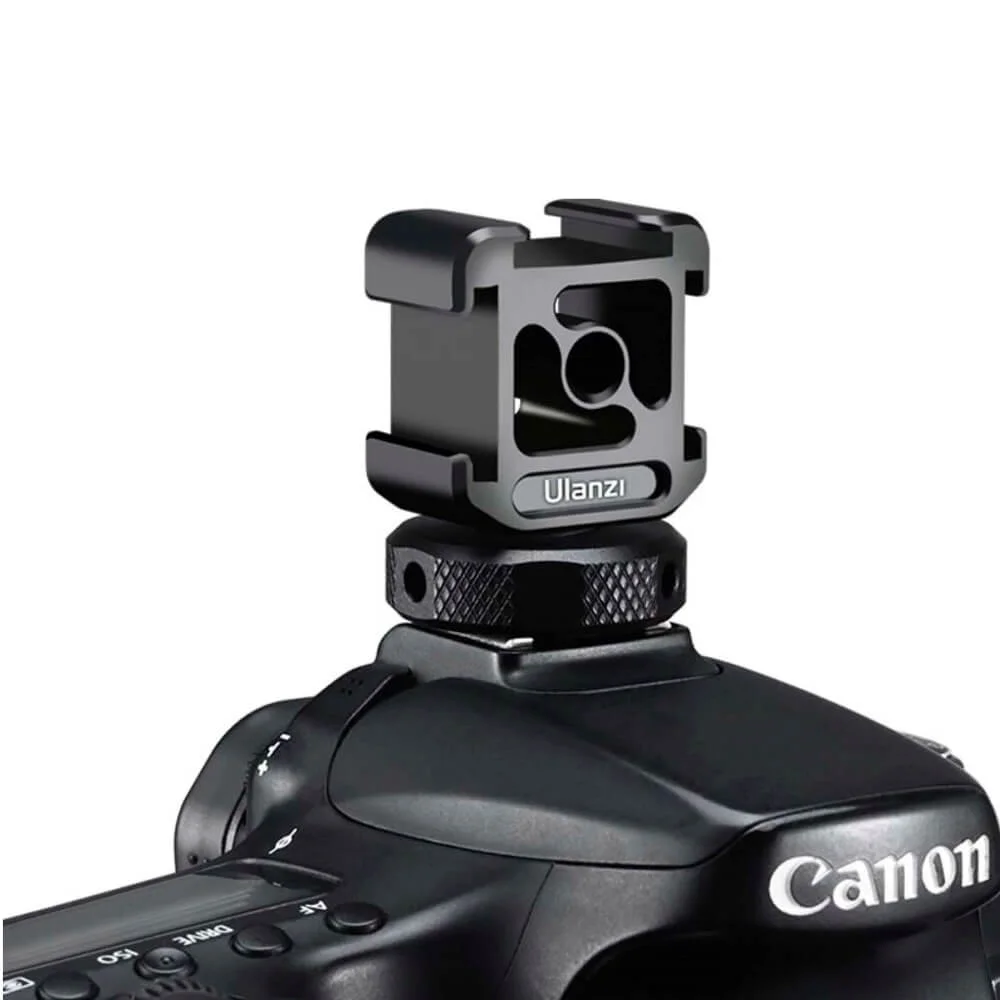 Este adaptador de montagem permite utilizar até três acessórios ao mesmo tempo, sendo possível conectar iluminadores de led, microfones, monitor ou qualquer outro equipamento que possua encaixe tipo sapata fria (cold shoe) durante a captura de vídeo com sua câmera DSLR. O suporte possui um conector que fornece montagem direta com a sapata da câmera, ampliando sua usabilidade (que normalmente possui apenas um encaixe). Também conta com um orifício de encaixe com padrão de 1/4 polegadas bem no centro do suporte, que serve para adicionar outros acessórios com este padrão de montagem.