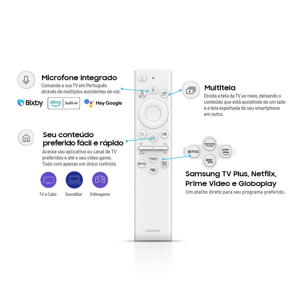 O suporte permite a instalação quase sem espaço entre a TV e a parede. Em termos de conectividade, apenas 1 fio fino conecta a The Frame a uma central de conexões externa, o One Connect, que liga a TV à energia e aos demais aparelhos. Moldura Customizáveis. Ainda mais estilo à sua decoração. Emoldure a The Frame na sua casa como uma obra de arte personalizada. Escolha uma das molduras disponíveis, que se encaixam na borda da tela, como ímãs. Quantum HDR. Veja as cenas claras e escuras com mais detalhes. O HDR aumenta o alcance dos níveis de luz na sua TV, proporcionando mais brilho, contraste e detalhes para você aproveitar o seu programa favorito tanto nas cenas mais escuras, quanto naquelas de alta luminosidade.