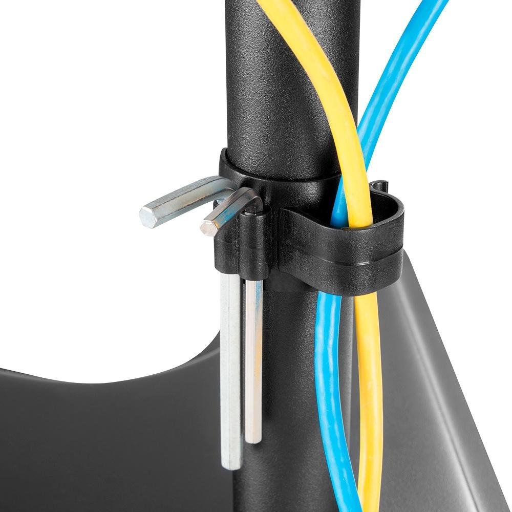 - Design e Ergonomia: Base triangular para até 27", estrutura em aço com acabamento plástico para durabilidade