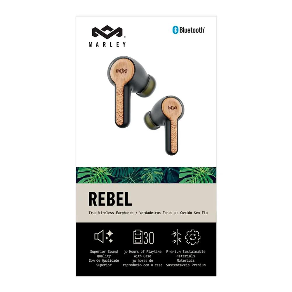Fone de Ouvido True Wireless Earbuds Rebel - House Of MarleyOuça o seu caminho com Rebel. Mergulhe nos detalhes de suas músicas favoritas com as pontas auriculares ultra confortáveis e com isolamento de ruídos. Com 8 horas de reprodução com uma única carga o estojo de carregamento portátil oferece 3 recargas para que você possa manter a música fluindo o dia todo. Além disso o microfone embutido é projetado com tecnologia avançada de cancelamento de ruído de eco para fazer e receber chamadas cristalinas. Conscientemente elaborado a partir de bambu natural e composto de fibra de madeira natural Rebel permite que você ouça com propósito a partir de um produto com propósito.Som Superior: Rebel foi projetado com modos Bass Boost EQ que intensificam a profundidade e a textura de cada batida para aprimorar suas músicas favoritas. Com a tecnologia de baixa latência experimente jogos e filmes perfeitamente sincronizados com o áudio então atrasos irritantes são coisa do passado.Recarregável e Compatível: Rebel oferece 8 horas de reprodução com uma única carga enquanto o estojo de carregamento oferece 30 horas no total. Compatível com IOS e Android você desfrutará do som clássico de Marley independentemente de coNossos fones de ouvido Rebel são construídos com um microfone de cancelamento de ruído Echo de alto desempenho para chamadas sem usar as mãos tornando-os perfeitos para o seu escritório em casa. Se o seu dispositivo estiver fora de alcance basta usar os controles de toque para gerenciar o volume reproduzir pausar e pular as faixas. Projetados para estilos de vida ativos esses fones de ouvido também são à prova de suor e resistentes à água IPX5.Materiais Sustentáveis: Abrace seu estilo natural com a mensagem de Marley de habilidade e sustentabilidade. Rebel é feito com bambu sólido composto de fibra de madeira natural nosso cabo trançado sustentável e entregue em embalagem 100% reciclável