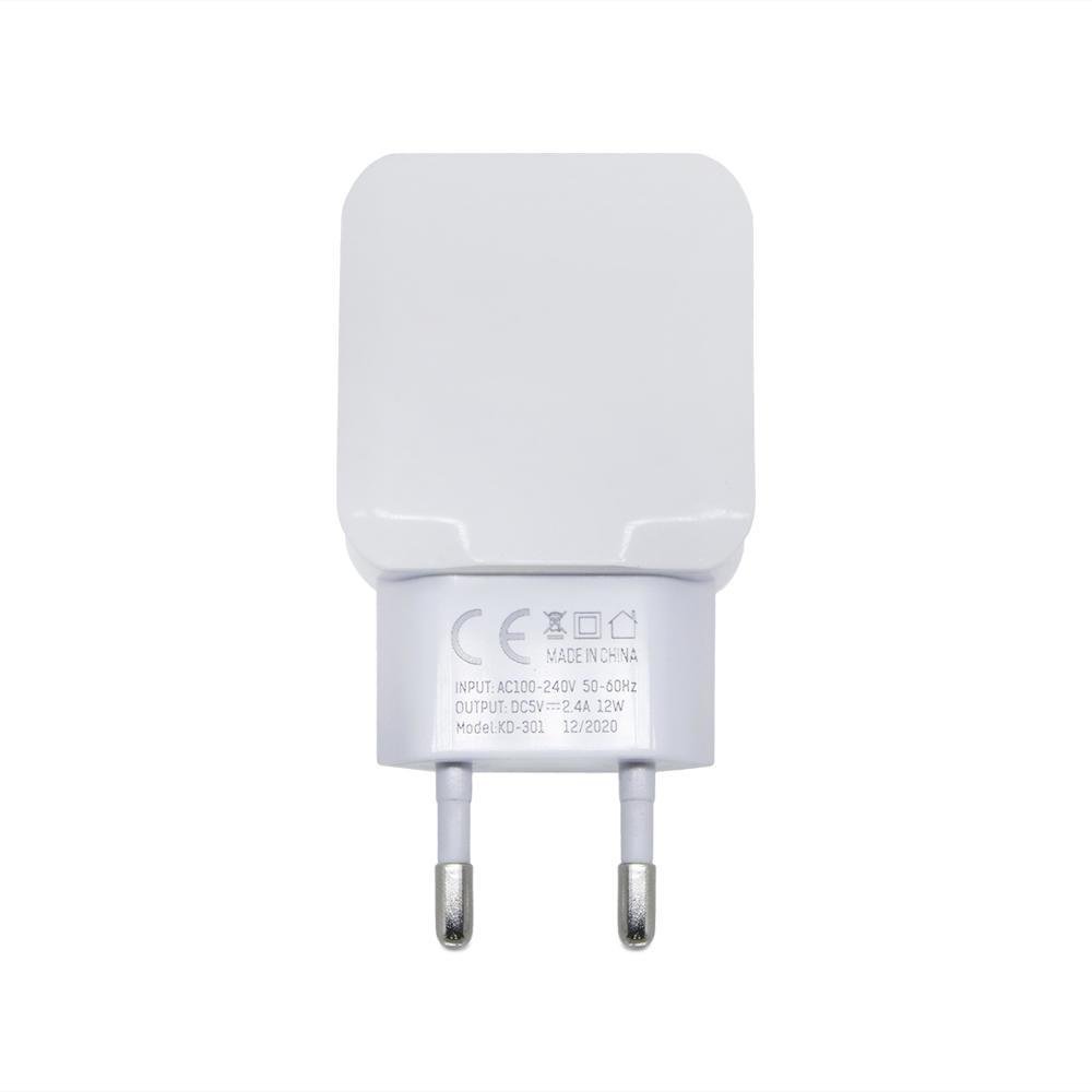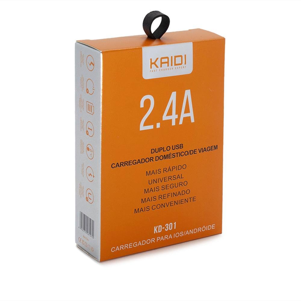 CARREGADOR DOMÉSTICO / VIAGEM DUPLO USB KAIDI KD-301 - 2 portas USB para IOS ou Android. - Proteção contra sobrevoltagem, curto circuito, sobrecarga de energia, alta temperatura e sobrevoltagem de saída - Conectividade universal com suprimento de 100 a 240 volts. Atende a demanda de energia de diferentes regiões e países - Carregamento de alta velocidade com saída de 2.4A - Fusível embutido que protege tanto o carregador como o seu aparelho - Produzido com material plástico de engenharia PC, retardador de incêndio