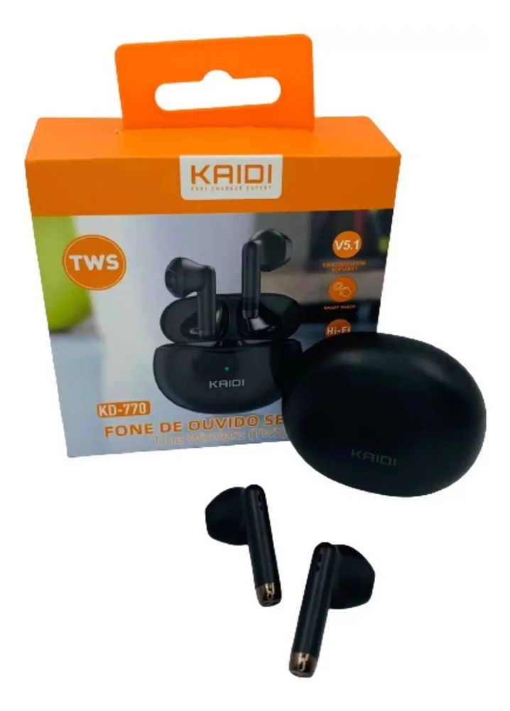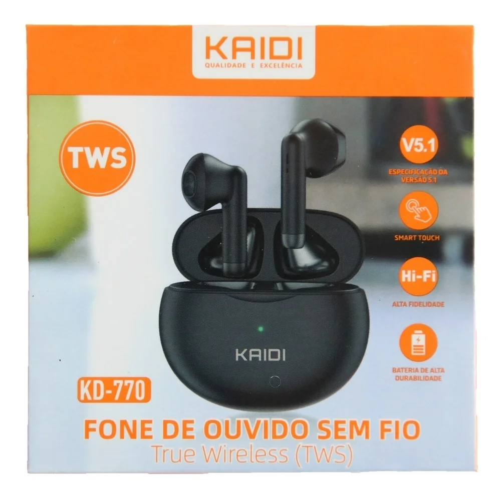 Características do ProdutoÉ sem fio: SimÉ resistente à água: SimCom luz LED: SimCom cancelamento de ruído: NãoCom microfone: SimDuração da bateria: 4 hFabricante: KaidiMarca: KaidiLinha: TWSCor: BrancoQuantidade de pares: 1Com modo mãos livres: SimCom microfone desmontável: NãoCom microfone flexível: NãoOrientações do microfone: DireitaUnidade de diafragma: 1 cmResposta em frequência: 20 Hz - 20.000 HzSensibilidade: 3 dBCapacidade da bateria do fone de ouvido: 30 mAhCapacidade da bateria do estojo de carregamento: 320 mAhInclui estojo de carregamento: SimCom carregamento sem fio: NãoÉ infantil: NãoTempo de carregamento do fone de ouvido: 1 hTempo de carregamento do estojo: 1,5 hQuantidade de microfones: 1Funções do controle: Controle de chamadas, Controle de músicasConfiguração de canais: 5.1Formato do fone de ouvido: In-earÉ monaural: NãoHomologação Anatel Nº: 185832114467Com Bluetooth: SimAlcance sem fio: 10 mCom tecnologia TWS: SimTipos de conectores: USB-CVersão de Bluetooth: 5.1Comprimento do cabo: 2 mCom assistentes de voz integrados: NãoAssistentes de voz integrados: SiriUsos adequados: EntretenimentoConsoles de videogames compatíveis: UniversalAcessórios incluídos: AlmofadasÉ à prova d'água: SimClassificação IP: IPX4DescriçãoDescubra uma nova experiência sonora com o Fone de Ouvido Sem Fio Kaidi TWS, desenvolvido para oferecer áudio de alta qualidade, design moderno e conforto prolongado. Ideal para quem busca praticidade no dia a dia, ele conta com conectividade Bluetooth estável, microfone embutido, controles intuitivos e bateria de longa duração, sem abrir mão do estilo.Compatível com a maioria dos dispositivos móveis, o fone proporciona graves potentes, agudos nítidos e isolamento de ruído eficiente, perfeito para chamadas, músicas ou vídeos com total imersão. Seu design in-ear garante conforto durante horas de uso, enquanto a resistência à água IPX4 permite utilizá-lo com segurança em atividades físicas ou ambientes externos.