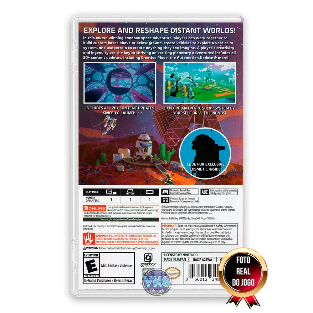 Nesta premiada aventura espacial sandbox, os jogadores podem trabalhar juntos para construir bases personalizadas acima ou abaixo do solo, criar veículos para explorar um vasto sistema solar e usar o terreno para criar qualquer coisa que possam imaginar. A criatividade e engenhosidade do jogador são a chave para prosperar em emocionantes aventuras planetárias! Inclui todas as mais de 20 atualizações de conteúdo, incluindo o Modo Criativo, a Atualização de Automação e muito mais!