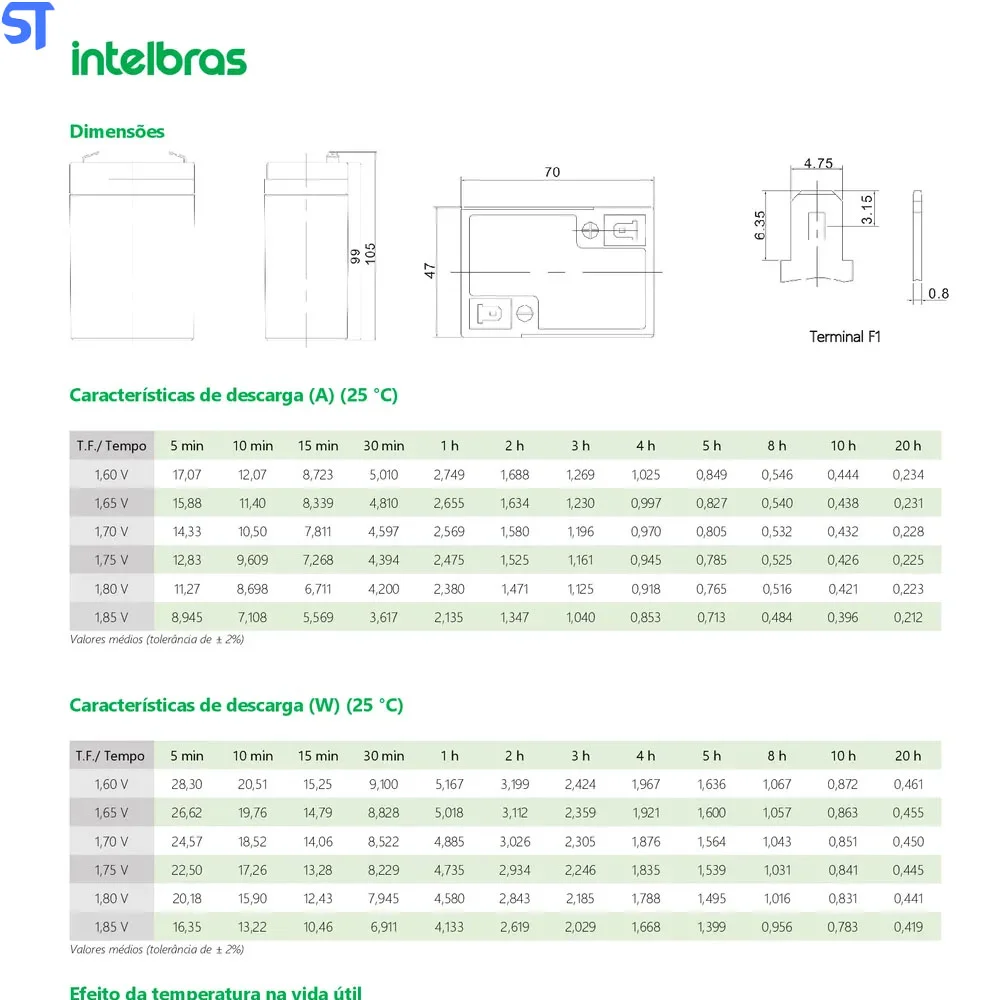 Descrição: consulte a especificação de batei, do seu equipamento especificações técnicas quantidade de células tensão total da bateria capacidade corrente máxirna de descarga resistência interna faixa de ter,eratura de operação xb 645 bateria vrla 6 v 4,5 ah a xb 645 é uma bateria de chumbo-ácido regulada por válvula selada vrla recarregável, livre de manutenção e protegida contra vazamento. Uma bateria para uso geral e com uma vida útil de até 8 anos em regime de flutuação, ideal para aplicação em iluminação de emergência e centrais de alarme. » ideal para iluminação de emergência, balanças, centrais de alarme* » tensão: 6 v » capacidade: 4,5 ah (c20) » qualidade e durabilidade asseguradas 6 v 4,5 ah em 20 h até 1,75 v (tensão final) por célula a 25 °c 45 a (5 segundos) aproximadamente 27 ao) descarga: -20 °c - 60 °c carga: o °c - 50 °c kmazenamento: -20 °c - 60 °c temperatura normal de operação 25°c t5°c tensão de recarga em flutuação 6,85 a 6,94 vcc corrente má>áma de recarga recomendada 1,35 a serviço cíclico e equalização 7,30 a 7,40 vcc
