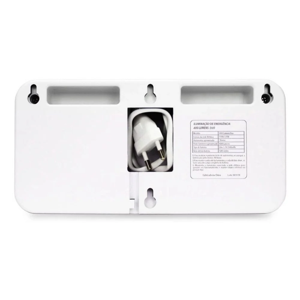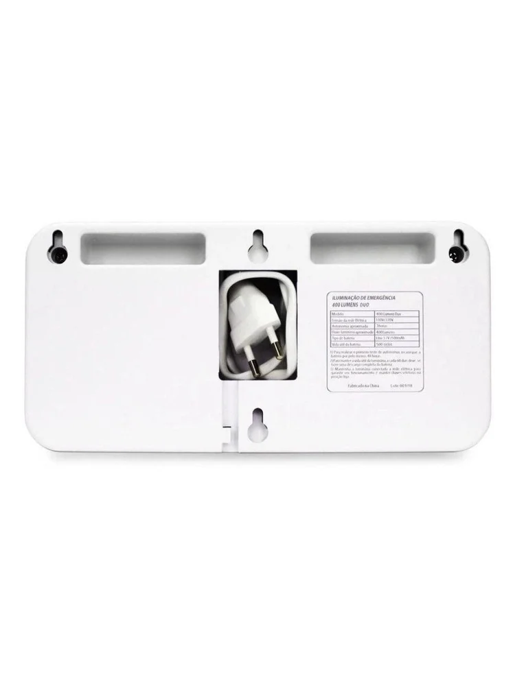 Descrição técnica ? A luminária 400 lúmens duo (le400d) foi fabricada com a tecnologia led, desenvolvida para iluminação de emergência (aclaramento). ? Possui bateria de lítio, proporciona uma vida útil mais longa e uma melhor performance do produto. Por ser de lítio, não ocorrem vazamentos, sendo ecologicamente correta. ? Econômica, proporciona autonomia com maior durabilidade e ótima iluminação. Pode ser facilmente instalada, manuseada e transportada. ? Acende automaticamente na falta de energia elétrica. ? Indicado para: ? Utilizada em ambiente internos, tais como: corredores, escritórios, hotéis, restaurantes, estabelecimentos comerciais, residenciais, etc. ? Cuidados e manutenção: ? Para maior vida útil do equipamento, recomenda-se a descarga da bateria a cada 3 meses. O procedimento auxilia na preservação das características iniciais do produto. ? Laudos e certificados: ? Este equipamento atende os requisitos exigidos pelas normas nacionais (nbr 10898). ? Informações adicionais: ? Possibilita montagem sobre caixa passagem 4x2 o que reduz o custo na instalação, garantindo um acabamento diferenciado. ? *imagens meramente ilustrativas.