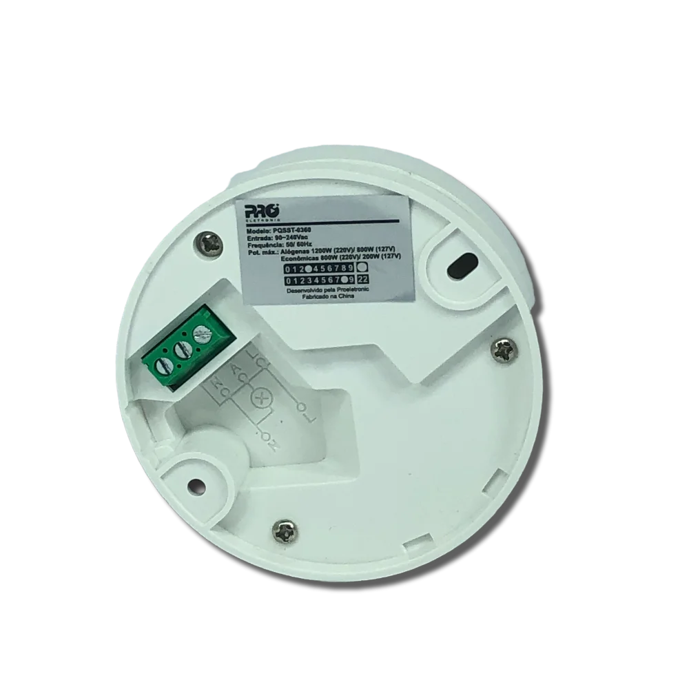 Sensor de presença sobrepor teto 360° pqsst-0360 o sensor de presença acendem e apagam as luzes ao detectar movimento no ambiente. Além disso, permite controlar várias lâmpadas com um único sensor. Habilite o sensor para acionar a lâmpada na luz do dia ou apenas à noite, isso proporciona economia de energia. Características técnicas tensão de alimentação: 90~240 vac; frequência: 50/ 60 hz; temperatura de operação:-10~40 °c; distância máx. Detecção: 8 m; altura de instalação: 2~4 ma; ângulo de detecção: 360°; ajustes de tempo: 10seg/1min/5min/10min; ajuste luminosidade: 300k | 30k; fotocélula: sol (dia e noite) | lua (noite). Potência máxima da lâmpada: incandescentes ou alógenas: 1200w (220v) | 800w (127v). Econômicas ou led: 300w (220v) | 200w (127v).