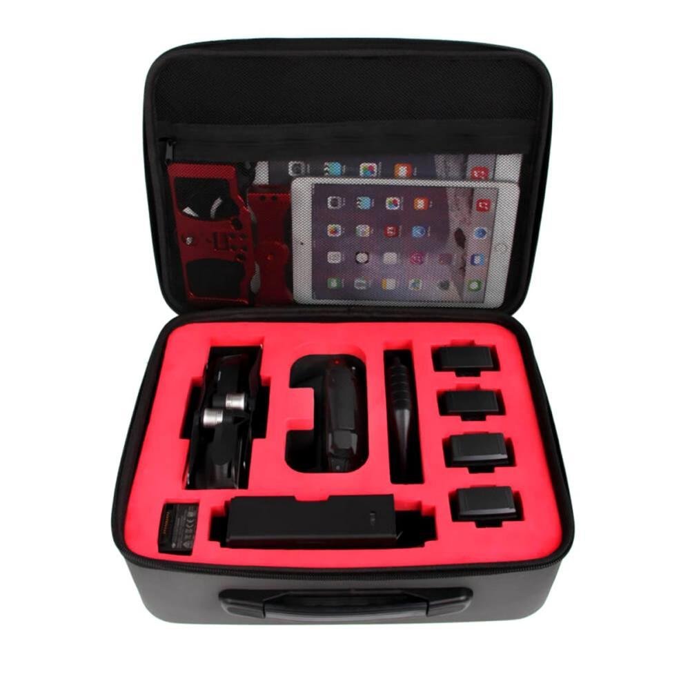 é uma case elegante e discreta, com vários compartimentos internos projetados especificamente para o transporte do drone dji mavic air com seus principais acessórios, como baterias (compartimento para 4 baterias extras), controle remoto, carregador, cabos, filtros, hélices e até mesmo um tablet.