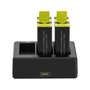 Conta com um tempo de recarga rápido, entre 2 horas até 2,5 horas para as três baterias, além de controle automático da carga, impedindo sobrecarga ou curto-circuito e alta eficiência de conversão de energia. Possui luz de led inteligente, indicando carregamento quando na cor vermelha e completamente carregada na cor verde. É leve, compacto e muito fácil para transportar dentro de cases, maletas, mochilas e muito mais!