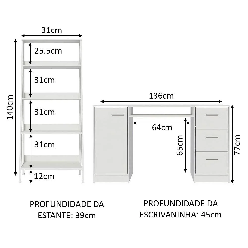 O conjunto da escrivaninha alaska + estante escada da madesa vai deixar seu home office ou ambiente de estudos muito mais aconchegante e organizado.a escrivaninha alaska possui tampo amplo, três gavetas com corrediças metálicas e um nicho abaixo do tampo, com abertura na parte de trás. Além disso, conta com uma porta com dobradiça metálica e ótimo espaço interno para guardar objetos.já a estante é super funcional e prática. No estilo cavalete, conta com divisórias bem dispostas e bastante lugar para organizar livros, revistas e decoração. Fica perfeita para compor a decoração da sua sala junto ao rack.o acabamento dos móveis é branco, feito em pintura poliéster de alta resistência. Esse método oferece mais proteção ao móvel, além de ser totalmente ecológico.medidas totais da escrivaninha:- 77 cm de altura- 136 cm de largura- 45 cm de profundidade.medidas totais da estante:- 140 cm de altura- 31 cm de largura- 39 cm de profundidadeitens inclusos:- uma (1) escrivaninha alaska- uma (1) estante escadacódigo do produto: mdfc02001609obs.:- as imagens são meramente ilustrativas- a madesa não disponibiliza serviço de montagem- o produto segue com as ferragens e manual com todos os passos para a instalação1 – o produto vem montado? Se não, vocês realizam a montagem?r.: a madesa não disponibiliza serviço de montagem. Todos os produtos seguem com manual de instalação e as ferragens necessárias. Alguns produtos possuem vídeo explicando o passo a passo da montagem.2– vocês possuem loja física? Posso retirar meu produto em mãos?r.: não possuímos loja física, apenas loja virtual. Confira as opções de envio ao colocar o seu cep.3 – qual é o valor do envio? Posso pagar separadamente?r.: o valor do envio é calculado com base no peso e volume do produto, e no cep de destino. Você pode calcular o valor e prazo de entrega no simulador.4– a madesa entrega em todo brasil? Como é feita a entrega?r.: sim, entregamos no brasil inteiro através de transportadoras parceiras.5– os produtos possuem garantia?r.: sim. A madesa oferece 3 meses de garantia para defeitos de fabricação.