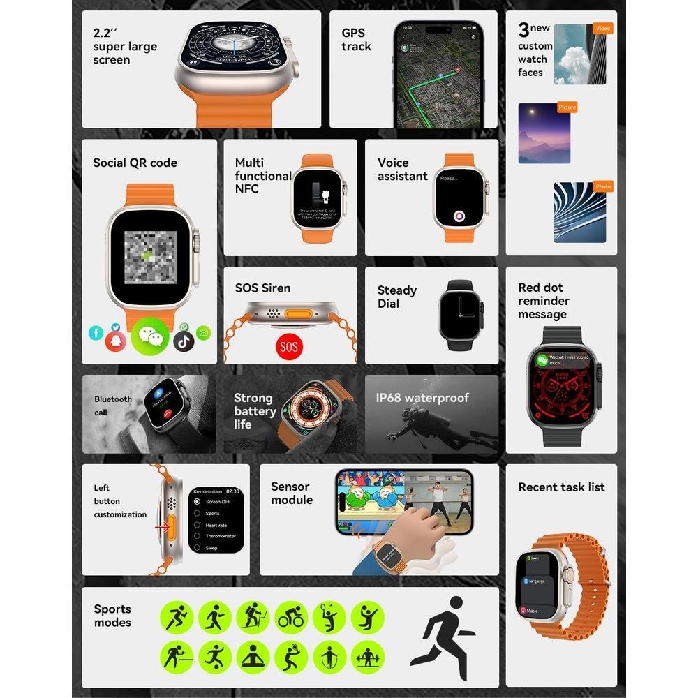 o novíssimo relógio inteligente ultra 9, último lançamento (fevereiro 2023), da microwear, possui uma tela sensível ao toque em super tela ips de 2.2 polegadas, com uma resolução de 428 * 518 pixels, com design em tela infinita.