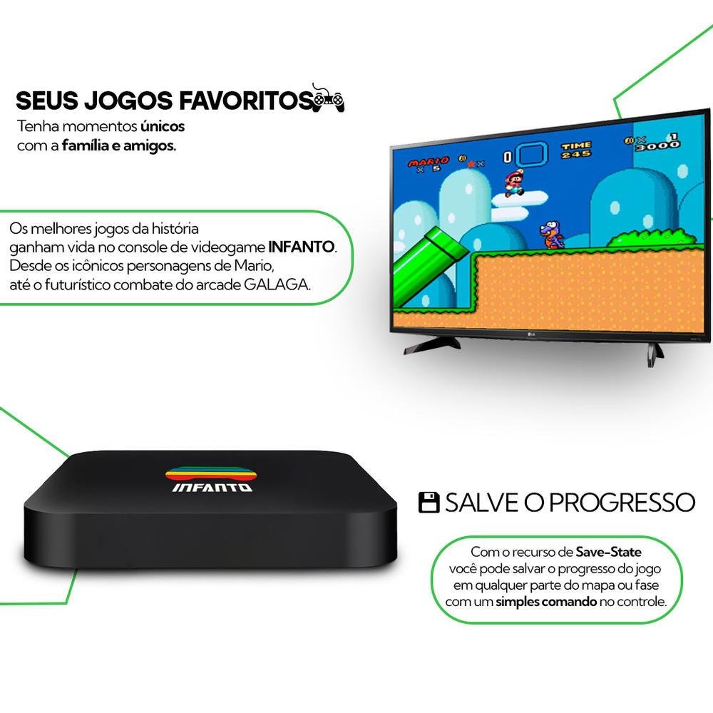 Os melhores jogos da história, ganham vida no console de videogame INFANTO. Desde os icônicos personagens do Mario, até o futurístico combate do arcade GALAGA.