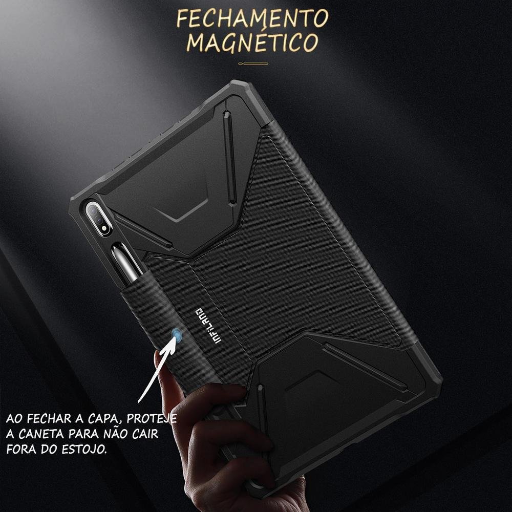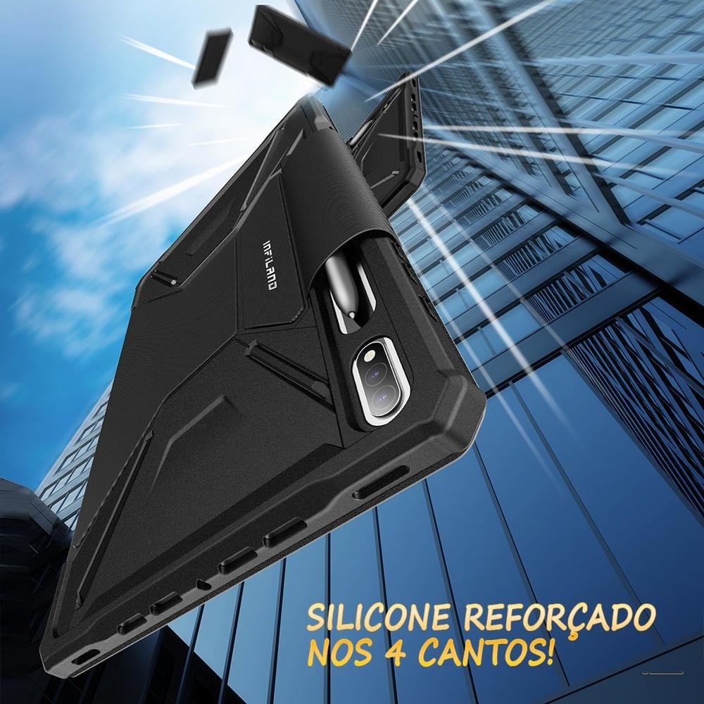 Destacamos: - acabamento premium oferecendo proteção anticolisão, antirrespingos e antirriscos. - capa macia de silicone e reforço nos quatro cantos. Espessura nos cantos de 5mm. - recorte preciso, para saídas e entradas como alto-falantes e câmera. - função wake-sleep: ativa a tela ao abrir e desativa ao fechar. - possui suporte para caneta modo vídeo desfrute do modo apoio facilitando o seu dia à dia para assistir vídeos, slides e digitar, com diferentes ângulos.