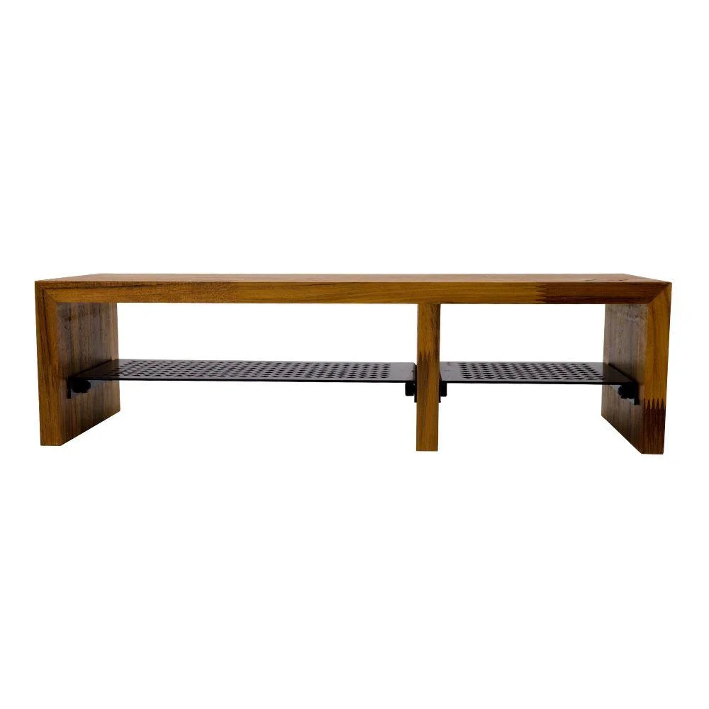 Apoio de monitor de madeira com prateleiras de metal. Pode ser usado para um ou dois monitores.