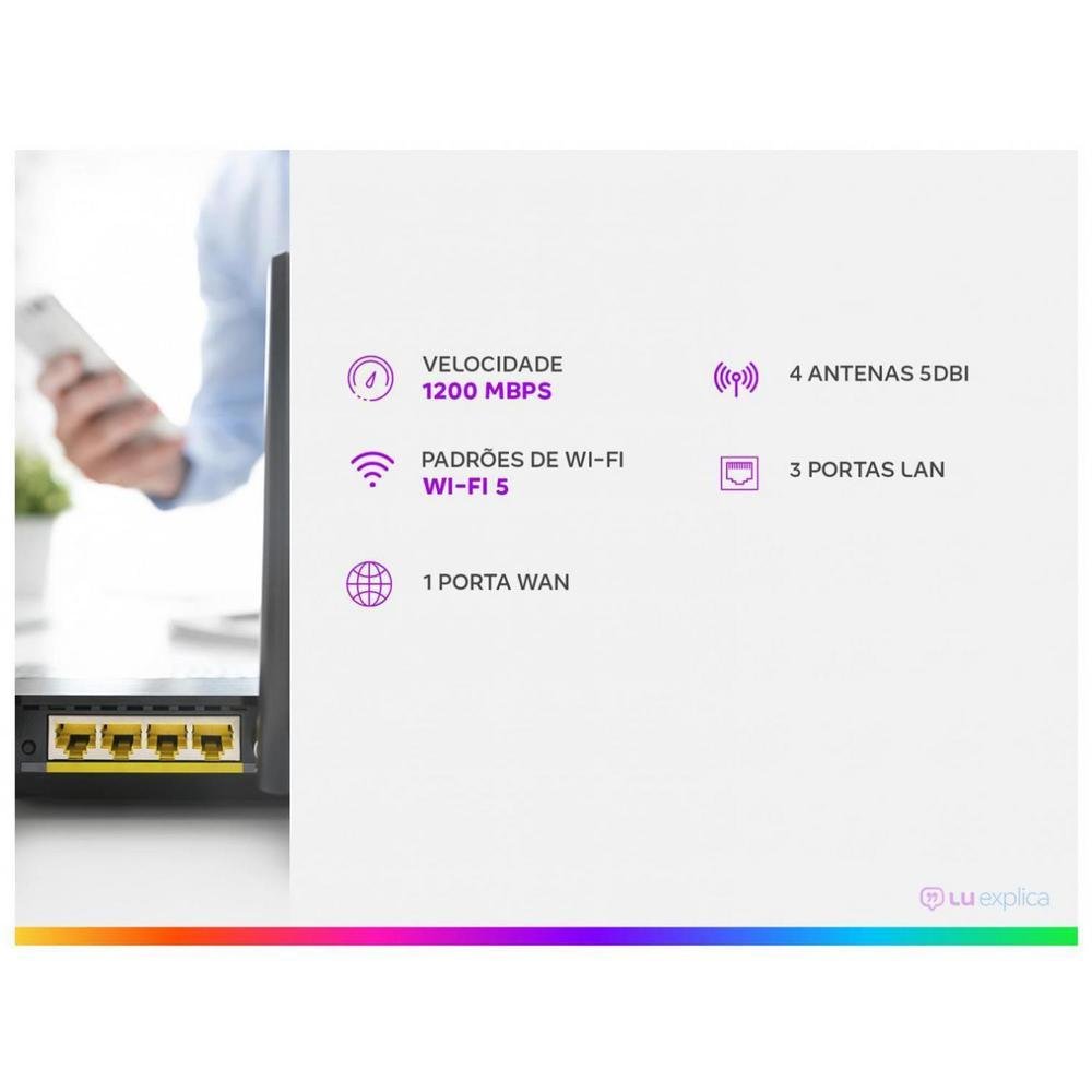 Ele vai ser ligado ao modem pra transmitir a internet pra vários equipamentos, sem usar nenhum fio. Além de smart TVs, smartphones, tablets e computadores, hoje em dia vários outros aparelhos podem ser ligados à rede com a ajudinha de um roteador. Até para usar aparelhos de casa inteligente e automações, você precisa de um roteador e um Wi-Fi confiáveis. O roteador D-Link TR-069 1200Mbps com 4 antenas e padrão Wi-Fi 5 com 4 portas é tudo o que você precisa para ter uma conexão de qualidade.