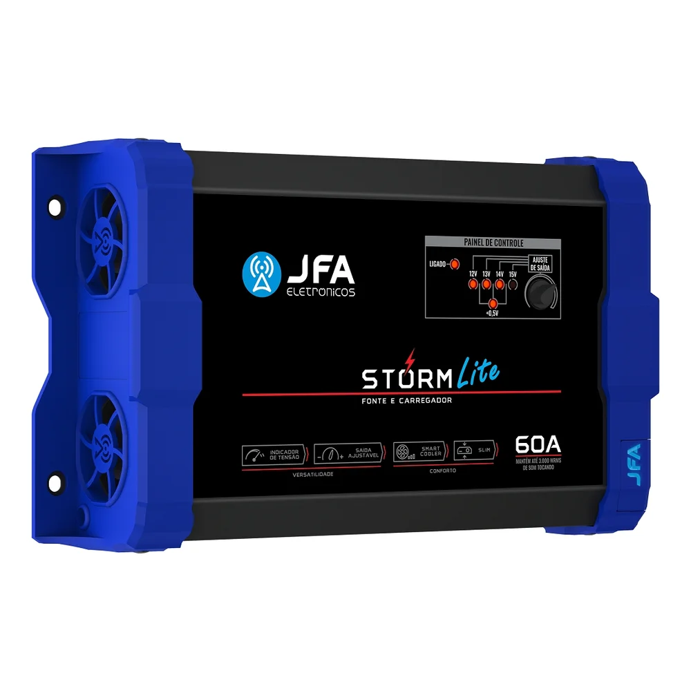 A fonte e carregador storm lite jfa é a melhor opção para alimentação com ótimo custo benefício. Seu diferencial é possuir a voltagem de até 15.2v, com a tensão para equalização dos vasos internos da bateria, única do mercado. diferenciais da fonte e carregador storm lite: saída ajustável, 12v até 15,2v ? Tensão para equalização dos vasos internos da bateria; indicador de tensão, com voltagem de até 15.2v; smart cooler ? Sistema de ventilação inteligente; slim ? Design arrojado e compacto;