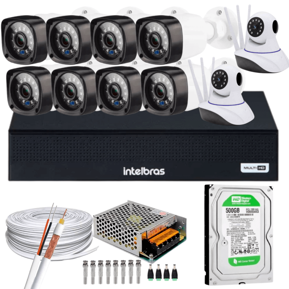 Kit Dvr Intelbras, 8 Canais, H.265, 500GB, 8 Câmeras, FULL HD, 20 Metros+2 Câmeras Ip, C/audio