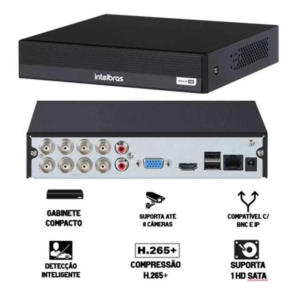 Kit Dvr Intelbras, 8 Canais, H.265, 500GB, 8 Câmeras, FULL HD, 20 Metros + 1 Câmeras Ip, C/audio