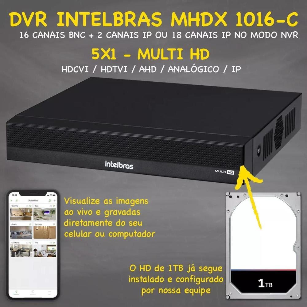 dvr de 16 canais intelbras mhdx 1016-c - modelo: mhdx 1016-c. - tecnologias: multi hd (hdcvi + hdtvi + ahd + analógica + ip). - quantidade de canais: 16 canais bnc + 2 canais ip ou 18 canais ip no modo nvr. - resolução de visualização: 1080p / 720p / 960h / d1 / cif. - resolução de gravação: 1080p lite/ 720p / 960h / d1 / cif. - compressão de vídeo: h.265+, h.265, h.264+, h.264h, h.264, h.264b. - conexão de rede: compatível com redes wi-fi através de adaptador usb (vendido separadamente) e cabo rj45 (10/100 m). - saídas de vídeo: vga e hdmi. - inteligência de vídeo: detecção inteligente de pessoas, veículos e/ou movimento, perda de vídeo e mascaramento. - modo de gravação: suporta 1 hd sata interno de até 18 tb. - acesso remoto: nuvem e ddns sem custo. - aplicativo de acesso remoto: intelbras isic, guardian.