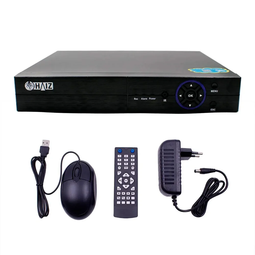 itens inclusos: 01 - nvr haiz 08 canais 01 - manual rápido em inglês (disponível qr code com manual em pt-br) 01 - controle remoto ir (sem pilhas) 04 - parafusos para fixar o hd (hd não incluso), (01 slot) 01 - mouse simples usb 01 - fonte de alimentação (descrição da fonte logo acima ver detalhes de entrada e saída)