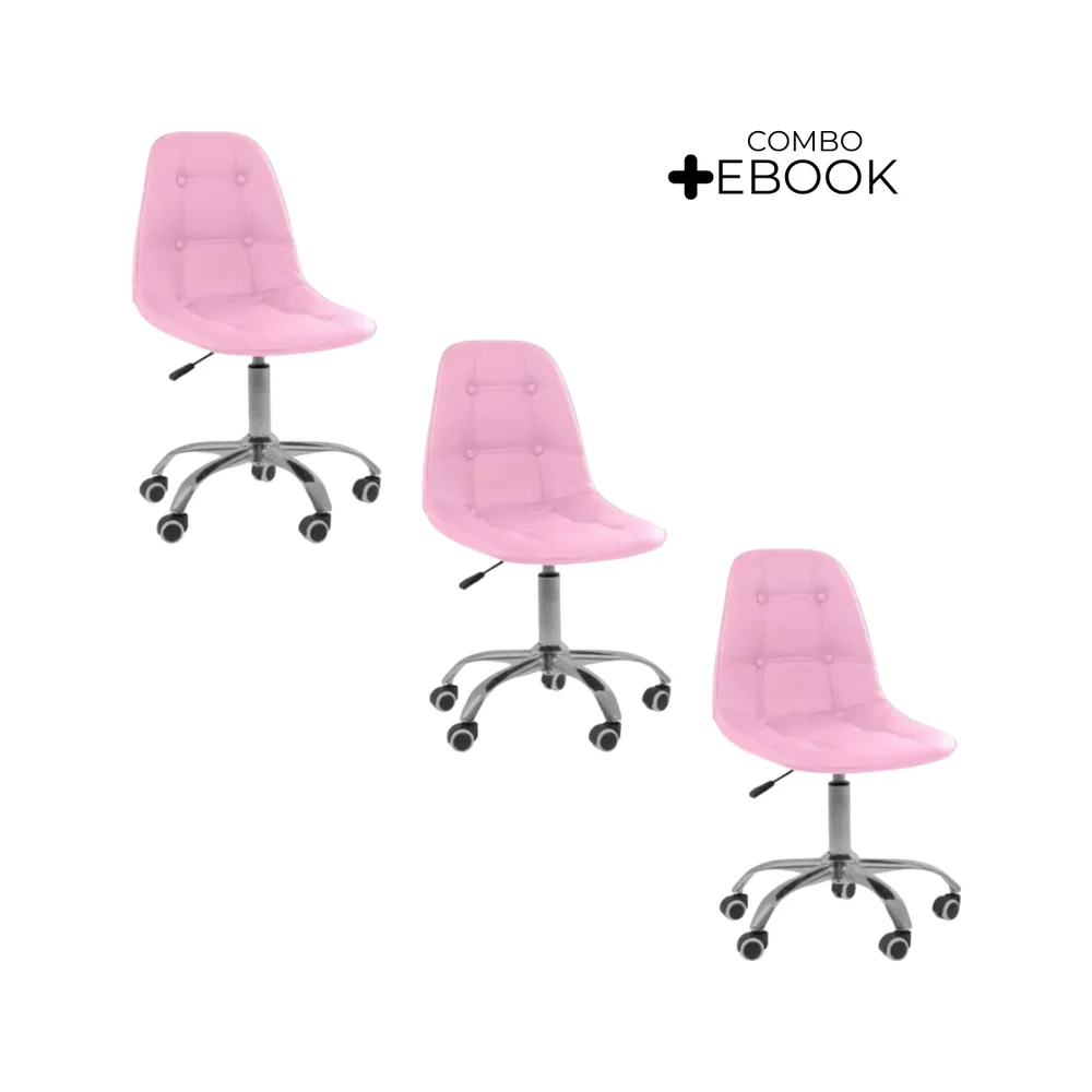 Kit 3 Cadeiras Office Oficial Webshop Eiffel Botonê, Peso Recomendado: 120 kg, Ajustável, Base Giratória, Rosa