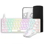 o hermes e4 é um combo periférico premium totalmente branco. O combo inclui um teclado mecânico branco multicolorido de formato de 61 teclas, um mouse rgb preciso com 12.800 dpi precisos e finalizado com um tapete de mouse branco reforçado estendido.