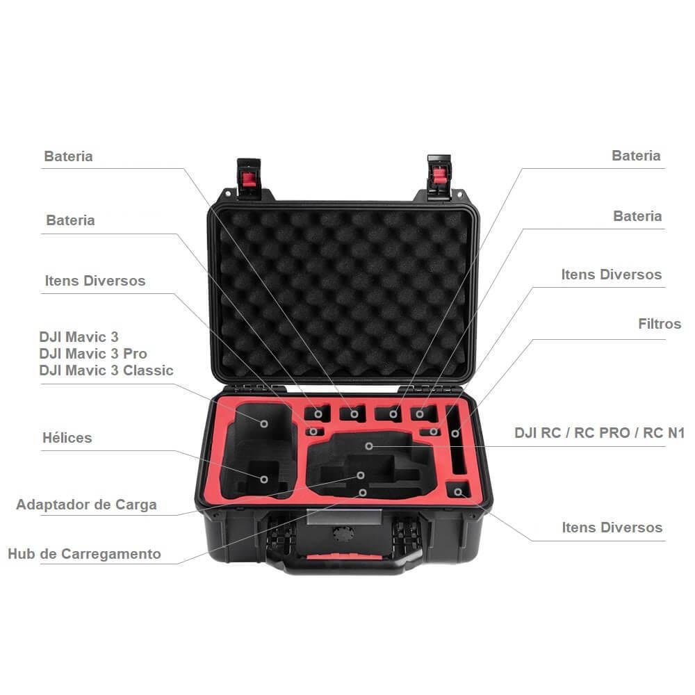Transporte seu drone DJI Mavic 3, DJI Mavic 3 Pro ou DJI Mavic 3 Classic e acessórios com segurança com este estojo rígido, robusto e resistente da Pgytech. A maleta estanque possibilita armazenar o drone, o controle remoto (modelo DJI RC-N1, DJI RC ou DJI RC PRO), hub de carregamento de bateria, até 4 baterias extras, carregador, filtros, um par de hélices sobressalentes, cabos e/ou outros pequenos objetos.