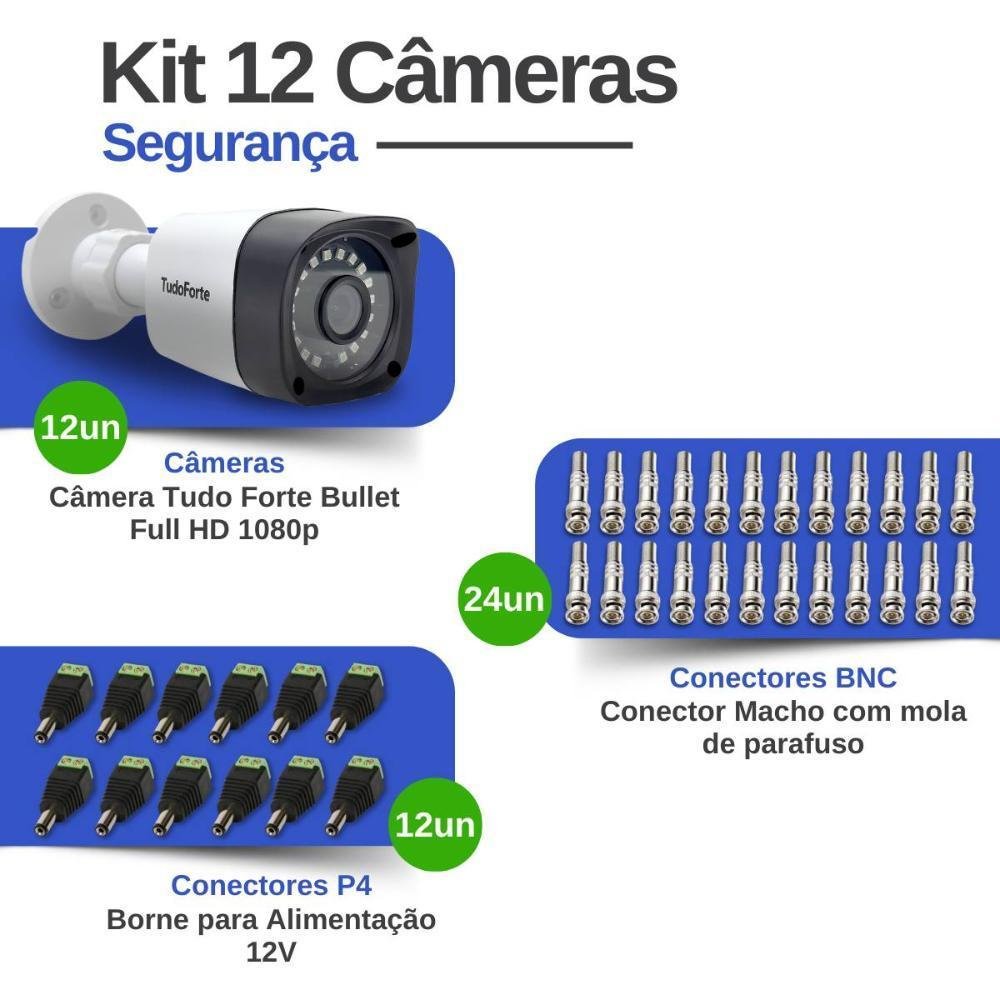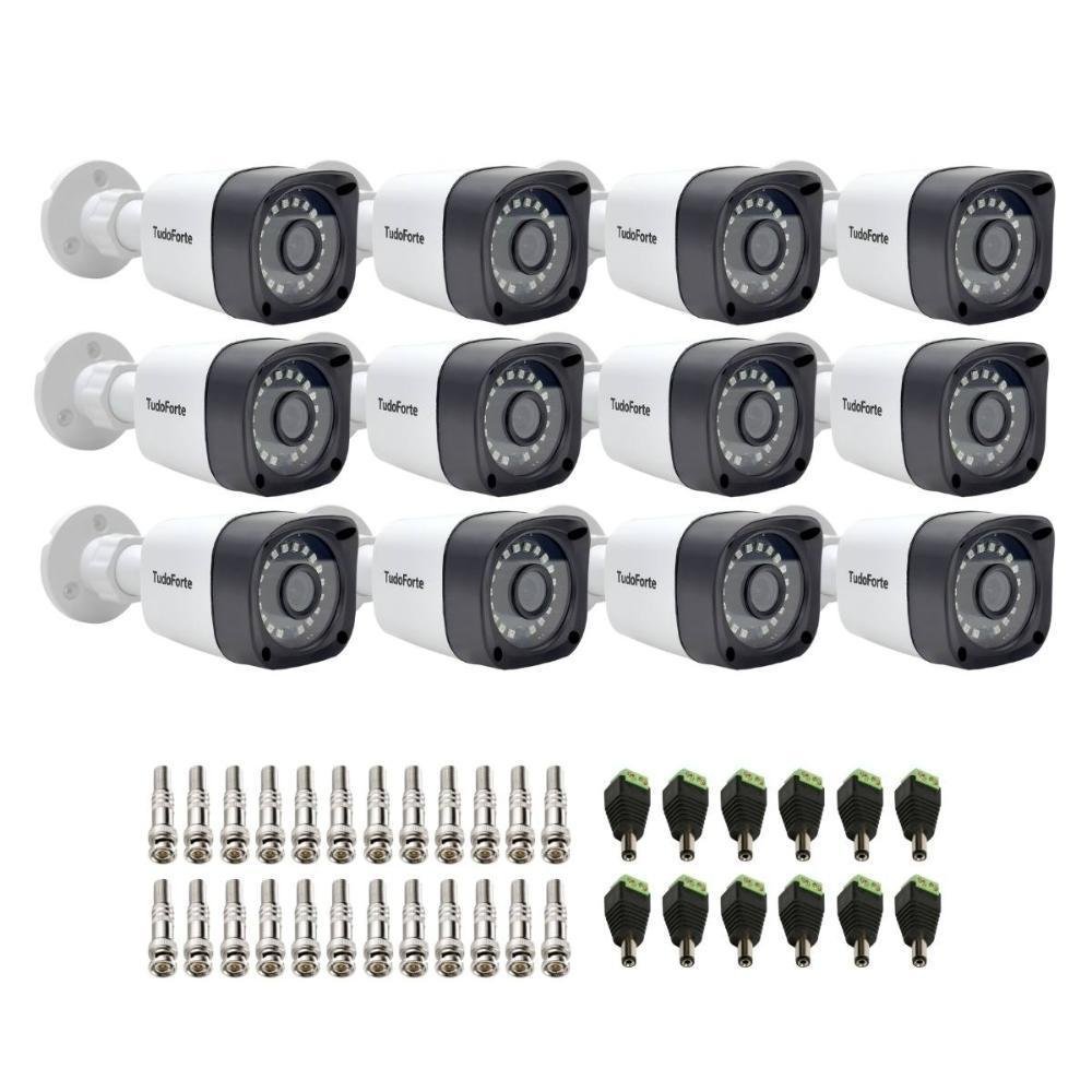 Kit 12 câmeras tudo forte bullet full hd 1080p, lente 2.8mm, visão noturna 20m, ip66 + conectores nós da tudo forte, criamos este kit para facilitar sua compra, e você não se preocupar com mais nada. A tranquilidade que faltava no seu dia-a-dia, dentro ou fora de casa ou do seu negócio. itens inclusos no kit 12 - câmeras tudo forte bullet full hd 1080p 24 - conectores bnc macho com mola de parafuso 12 - conectores p4 de borne para alimentação 12v características resolução full hd (1080p) alcance ir de 20 m proteção ip66 contra chuva e sol tecnologia compatível 4 em 1: ahd, hdtvi, hdcvi, analógica lente com amplo ângulo de visão 1 ano de garantia *para ter acesso ao menu da câmera e alterar sua tecnologia é necessário o uso de um dvr multi hd. enxergue no escuro essa câmera pode alcançar uma distância de até 20 metros no escuro, por isso ela também pode ser utilizada em ambientes com pouca ou nenhuma luminosidade. qualidade de imagem full hd 1080p essa câmera full hd 1080p 2mp possui captura de imagens com resolução de 1920x1080p (full hd) que proporciona imagens muito mais nítidas e ricas em detalhes. câmera pra qualquer clima com case plástica no modelo bullet essa câmera é ideal para instalação em ambientes tanto internos como externos,além de possuir proteção contra surtos de tensão garantindo ainda mais segurança. custo benefício garantido a linha de câmeras de segurança infravermelho de até 20 metros foi desenvolvida para atender os projetos de cftv que buscam preço atrativo e qualidade de imagem. especificações da câmera 1080p tudo forte modelo 1080p tudo forte características resolução full hd (1080p)